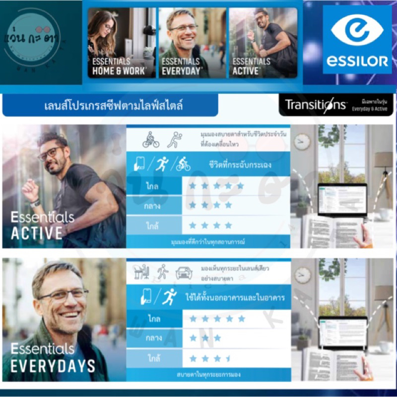 ตัดแว่น เลนส์ Essilor progressive โปรเกรสซีฟ Essentials / varilux / Blue uv capture Transition Gen8 / Tranclassic / RX