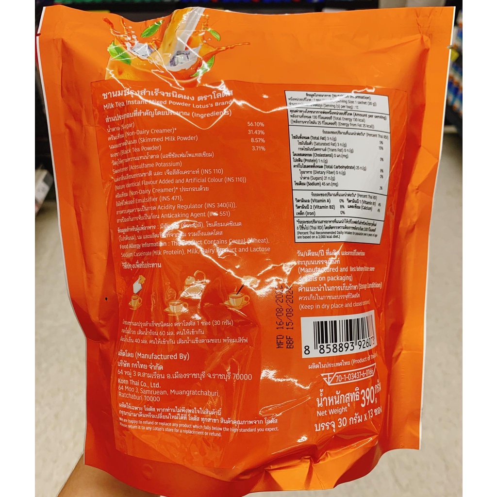 โลตัส ชานม ผงชานมชงสำเร็จรูป อร่อย กลมกล่อม ชื่นใจ (Lotus Milk Tea) 30 กรัม x 13 ซอง