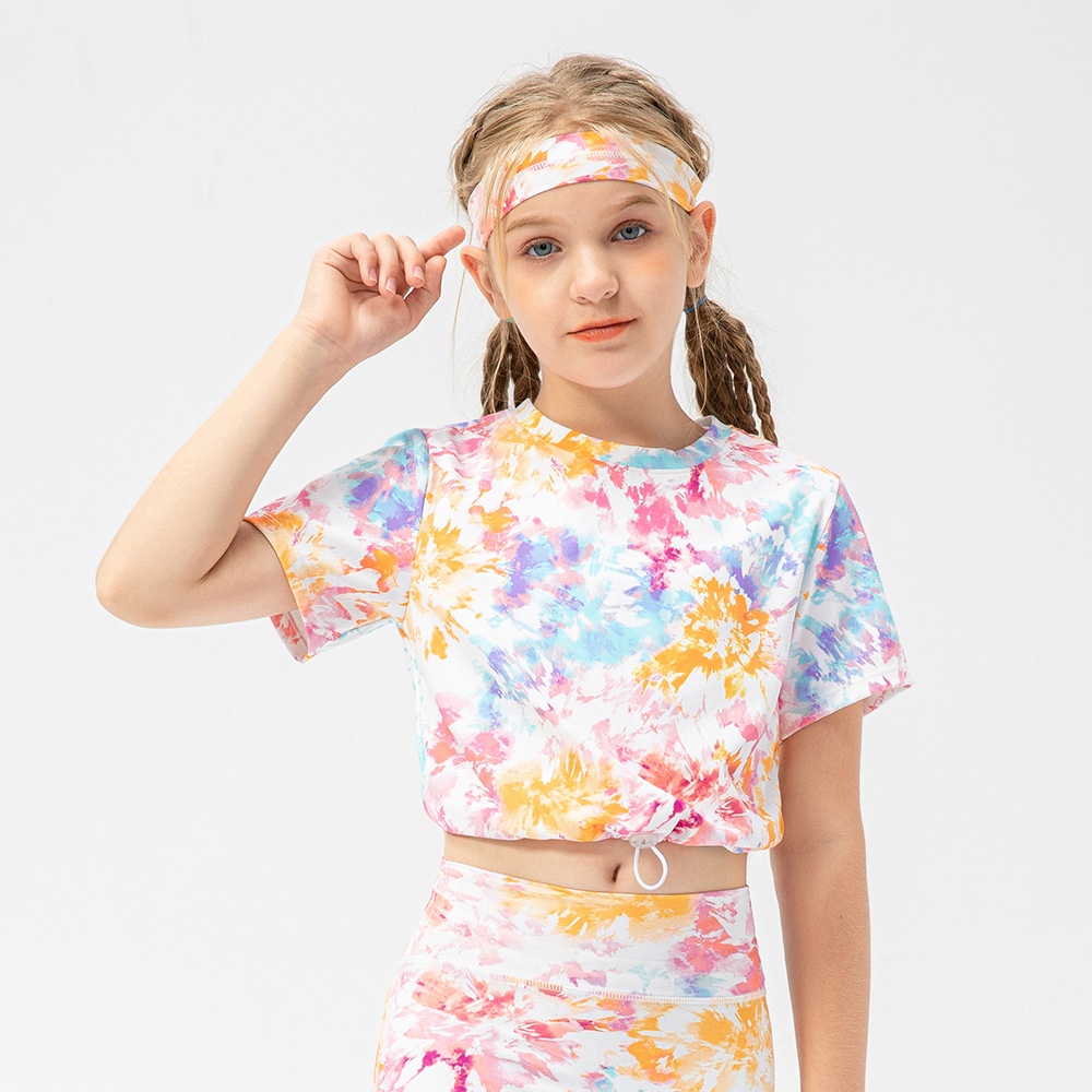 เสื้อยืดแขนสั้น คอกลม พิมพ์ลาย เหมาะกับใส่เต้นรํา เล่นโยคะ ฟิตเนส สําหรับเด็กผู้หญิง 5-12 ปี
