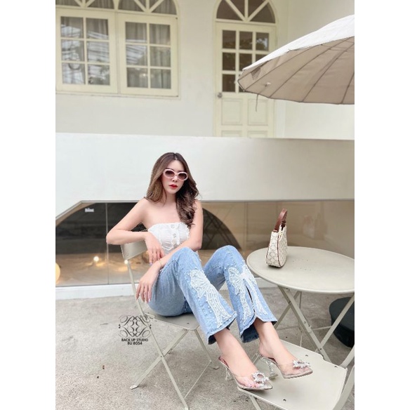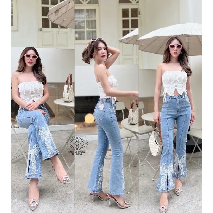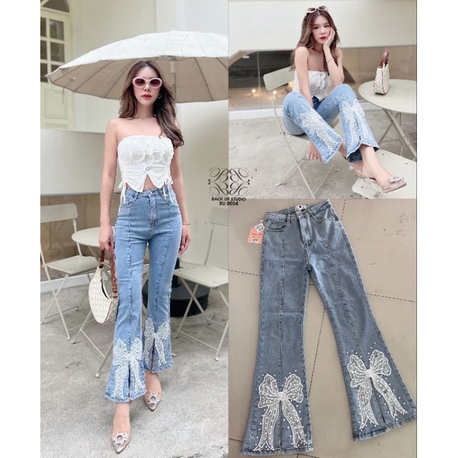 Bu8054 🎀กางเกงยีนส์เอวสูงขาม้าแต่งโบว์ปลายขาน่ารักๆทรงสวย ใส่เที่ยว เกร์ๆ กางเกงยีน กางเกง