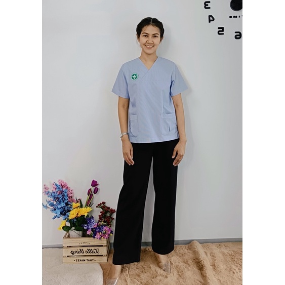 เสื้อสาธารณสุข ปักชื่อฟรี เสื้ออนามัยลายริ้วสีฟ้า คอวีป้าย คอวี คอกลมกระดุมบ่า พร้อมส่งแบรนด์มาเต็ม