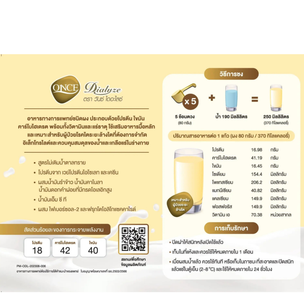 ONCE Dialyze วันซ์ ไดอะไลซ์ อาหารทางการแพทย์ สำหรับผู้ป่วยล้างไต กลิ่นวานิลลา 400กรัม/ 800 กรัม