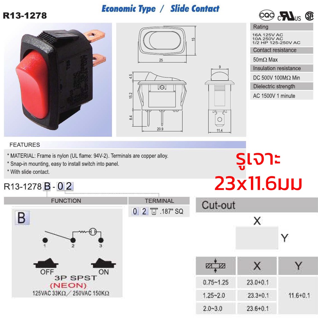 SCI R13-1278B-02R สวิทช์กระดก 1ทาง 3ขา ไฟสีแดง 250V AC 10A เปิดปิด ON-OFF 3P SPST สวิทช์ไฟ 220V Toggle Switch