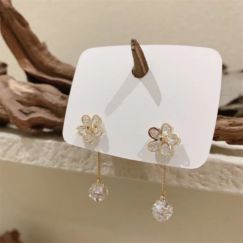 ใหม่ ต่างหูเพทาย ดอกไม้ บอล เกาหลี ยาว สําหรับผู้หญิง 2022 เครื่องประดับ เก๋ไก๋ เรียบง่าย ด้านหน้าและด้านหลัง