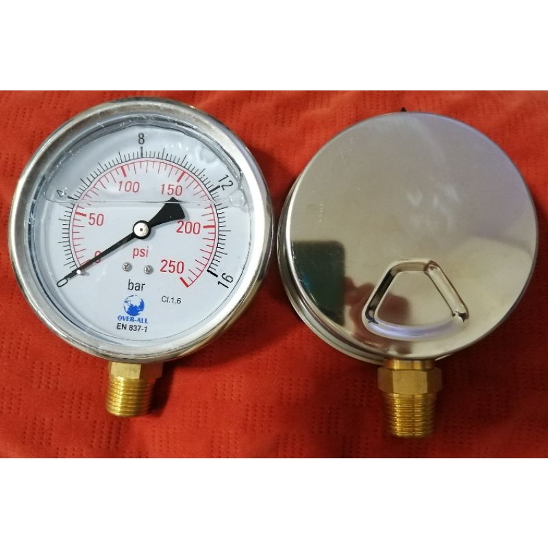 เกจแรงดัน0-16 Barหน้าปัด 4" ตัวเรือนสแตนเลส มีน้ำมัน เกลียวทองเหลืองออกล่าง 1/2"