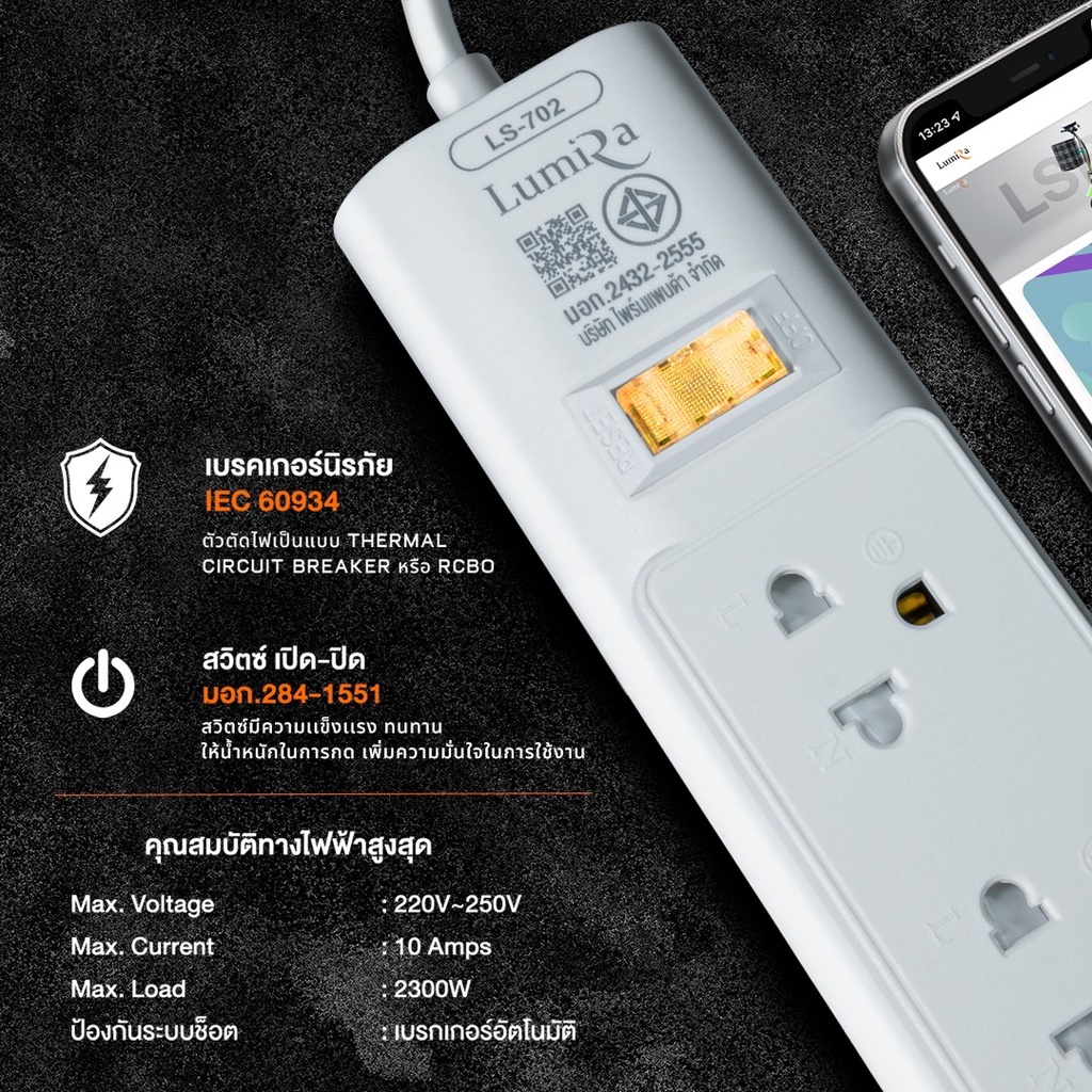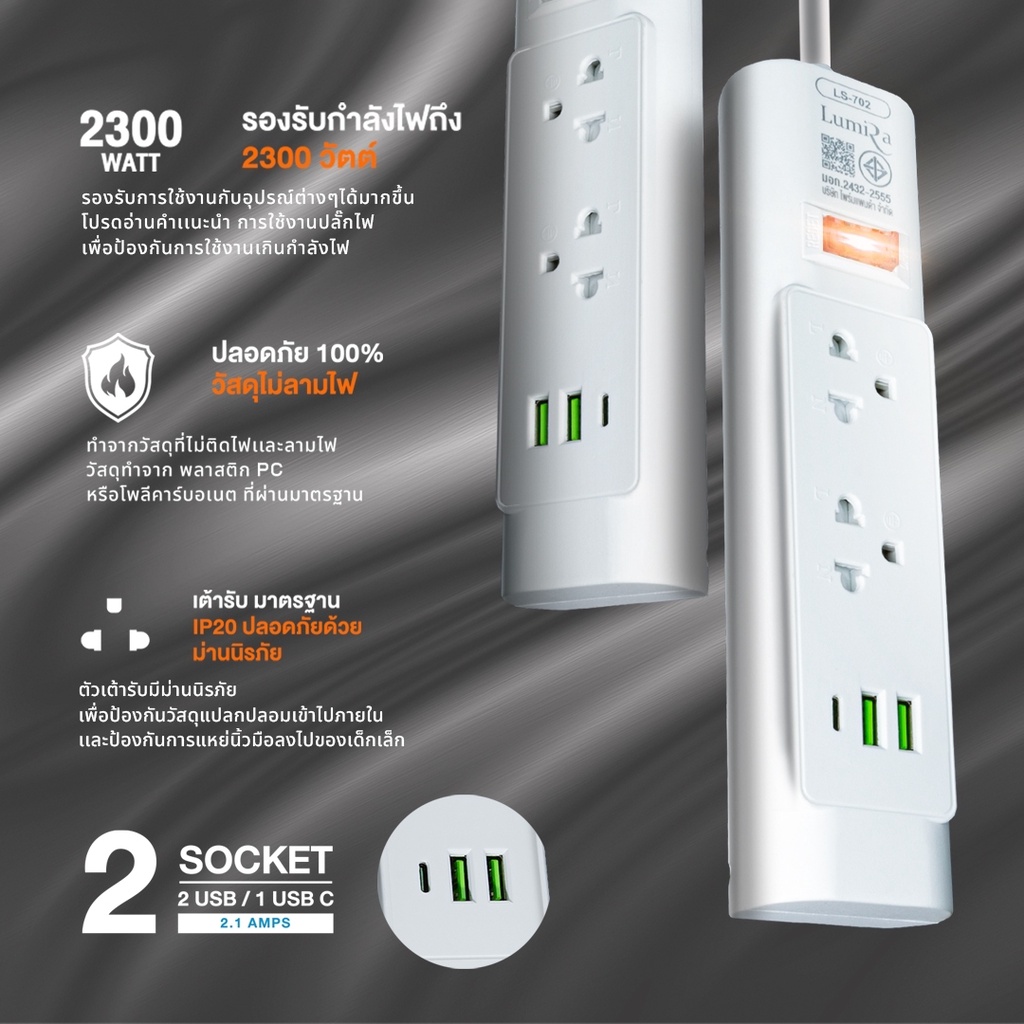 Lumira ปลั๊กไฟ รุ่น LS-702 2เต้ารับ 2USB 1Type-C สวิตช์รวม สายยาว 1.5M/2M มอก. รับประกัน 3ปี