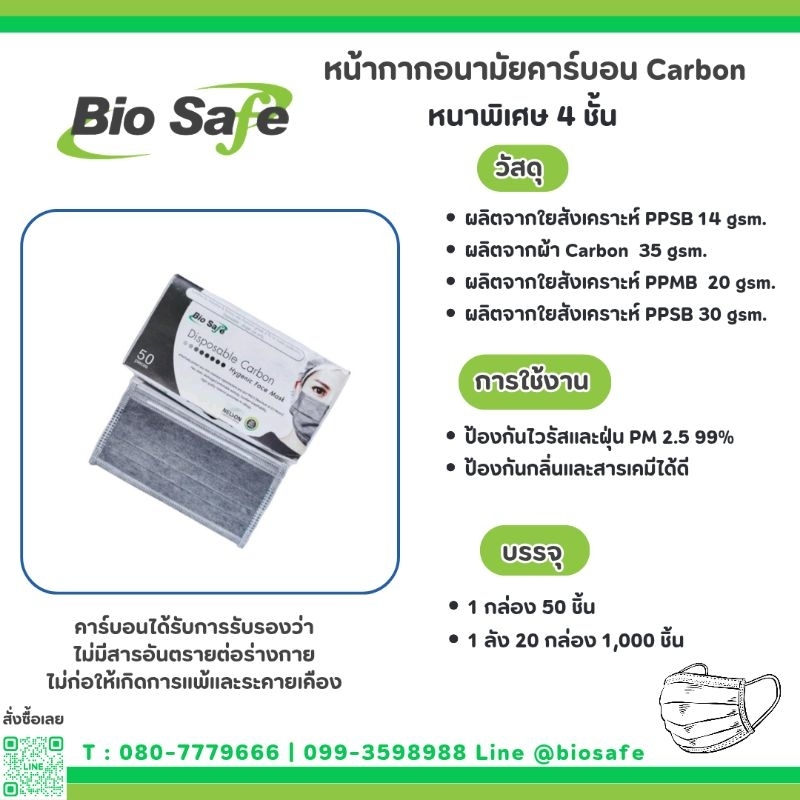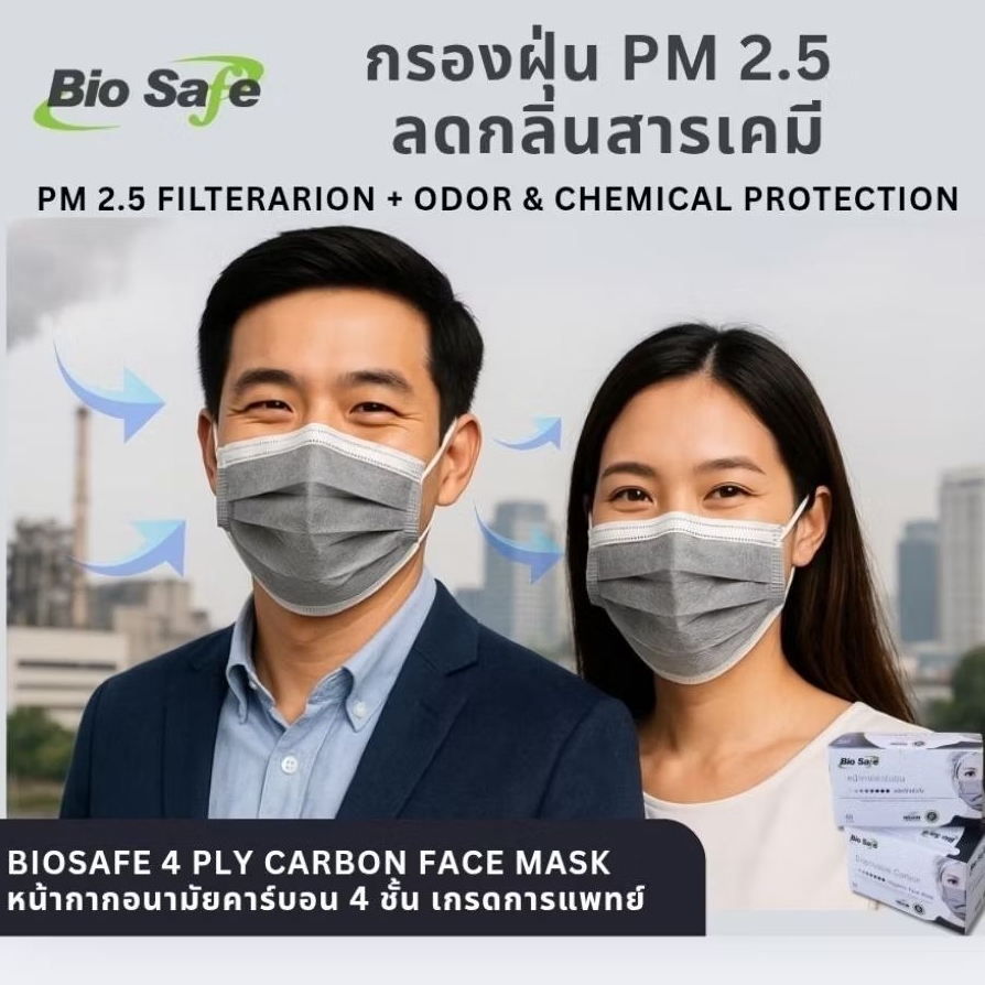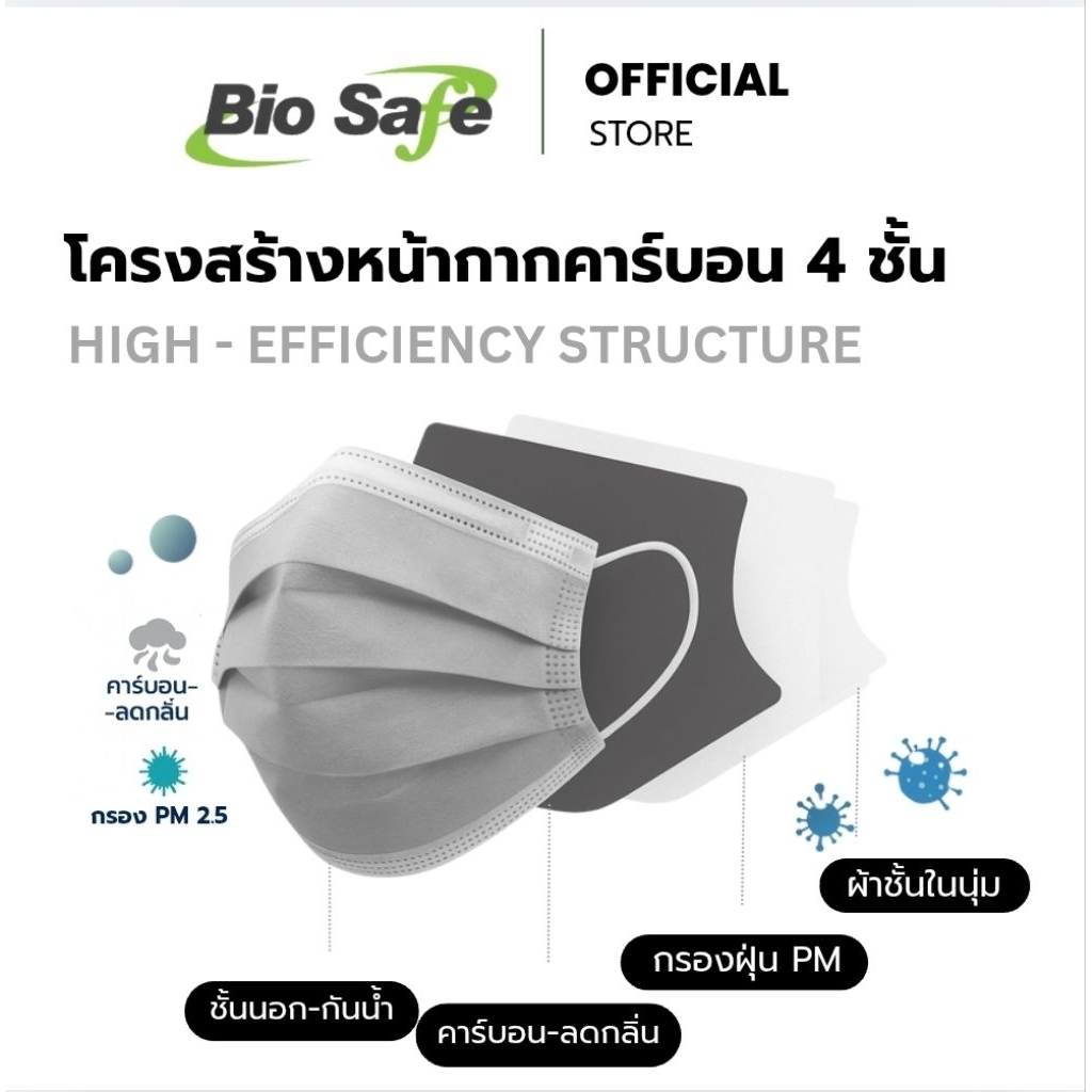 หน้ากากอนามัยคาร์บอน 4 ชั้น BioSafe สีเทา กรองกลิ่น กัน PM2.5 กล่อง 50 ชิ้น