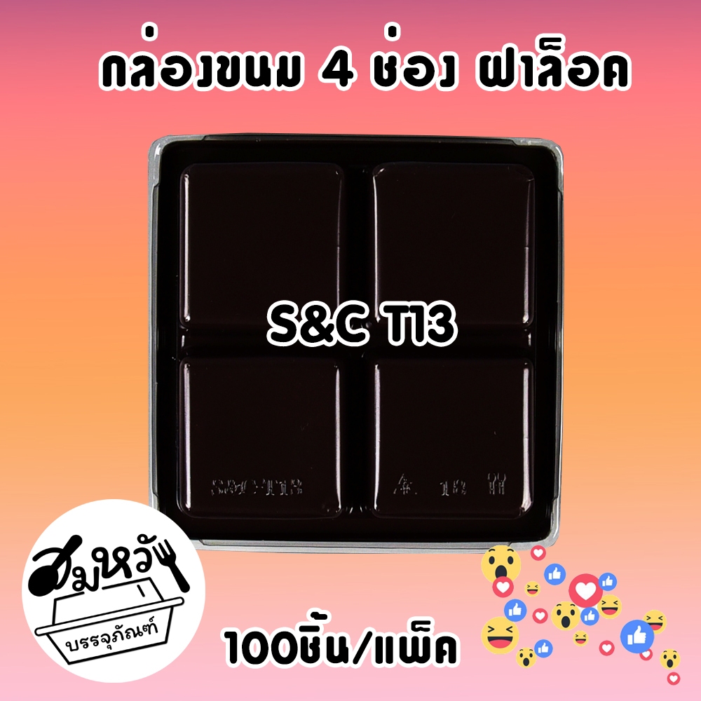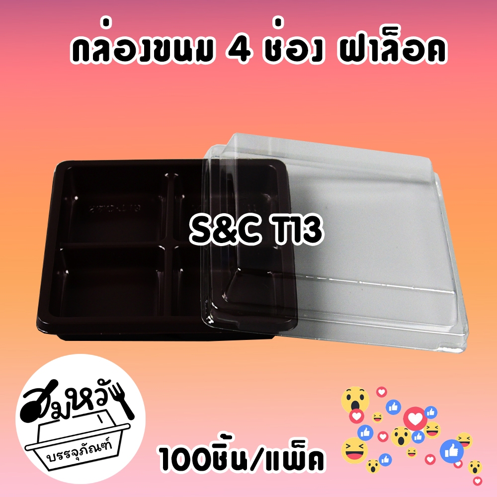 กล่องใส่ขนม 4 ช่อง S&C รุ่น T-13 ฐานดำฝาใส ฝาล็อคง่ายสุดๆ (100ชิ้น/แพ็ค)