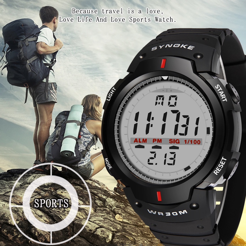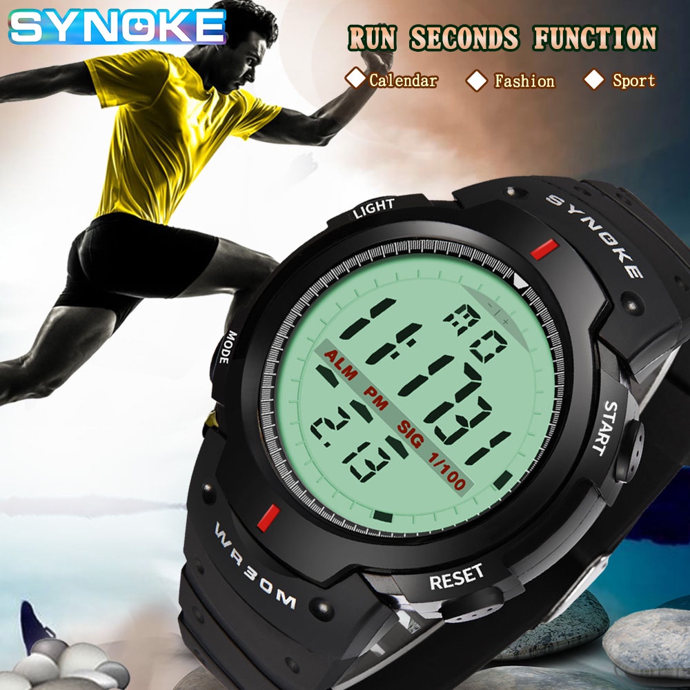 SYNOKE นาฬิกาผู้ชาย 30M กันน้ำอิเล็กทรอนิกส์ LED ดิจิตอลนาฬิกาข้อมือกีฬากลางแจ้ง
