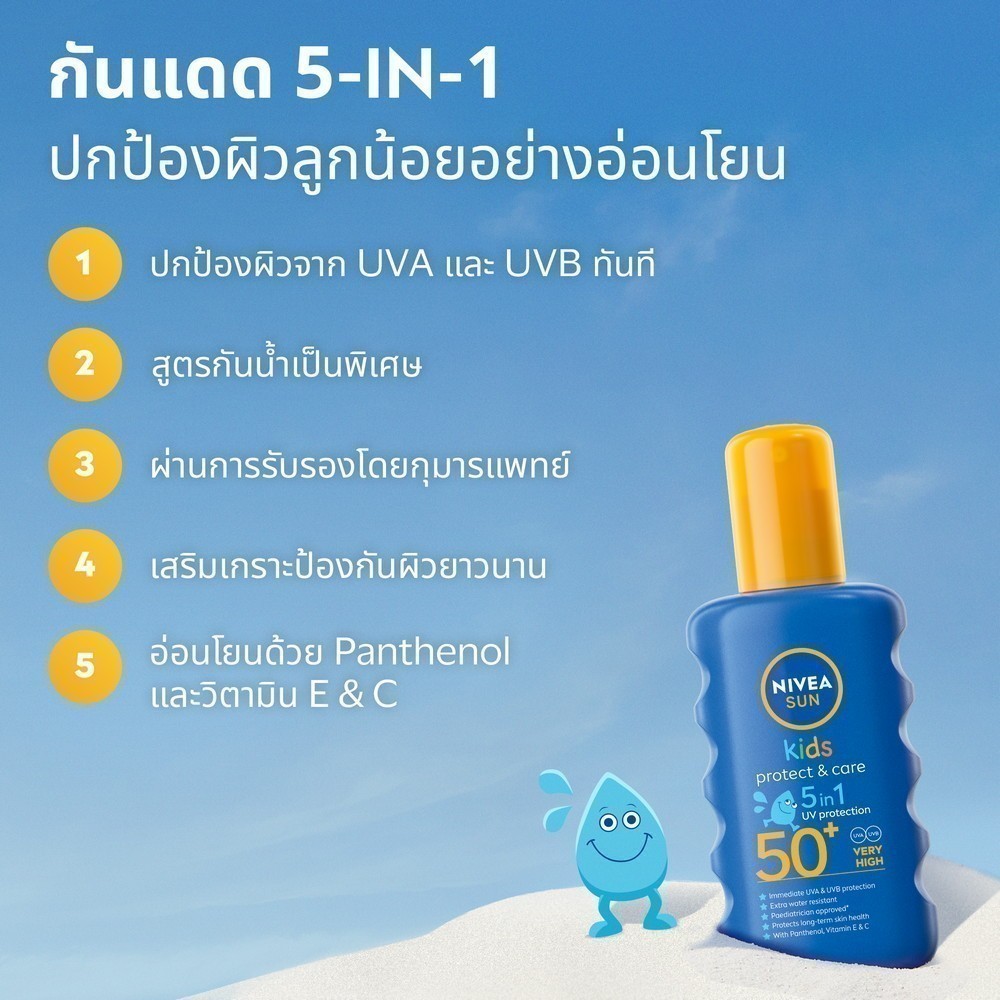 นีเวีย ซัน คิดส์ โพรเท็ค แอนด์ แคร์ 5อิน1 ยูวี โพรเทคชั่น สเปรย์กันแดดเด็ก เอสพีเอฟ50+ 200 มล. NIVEA กันแดดเด็ก
