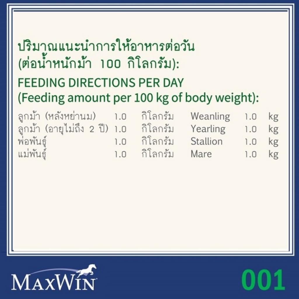 Maxwin001เขียว อาหารม้า สำหรับม้าแรกเกิดถึง 2 ปี พ่อพันธุ์ แม่พันธุ์ ขนาด 30 kg.