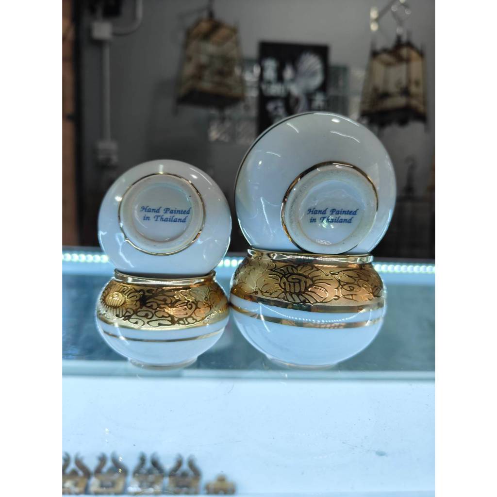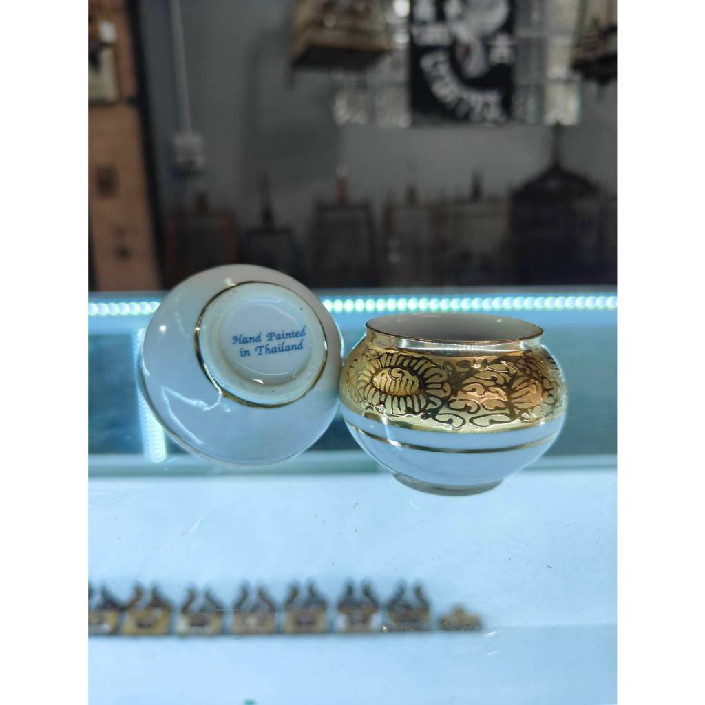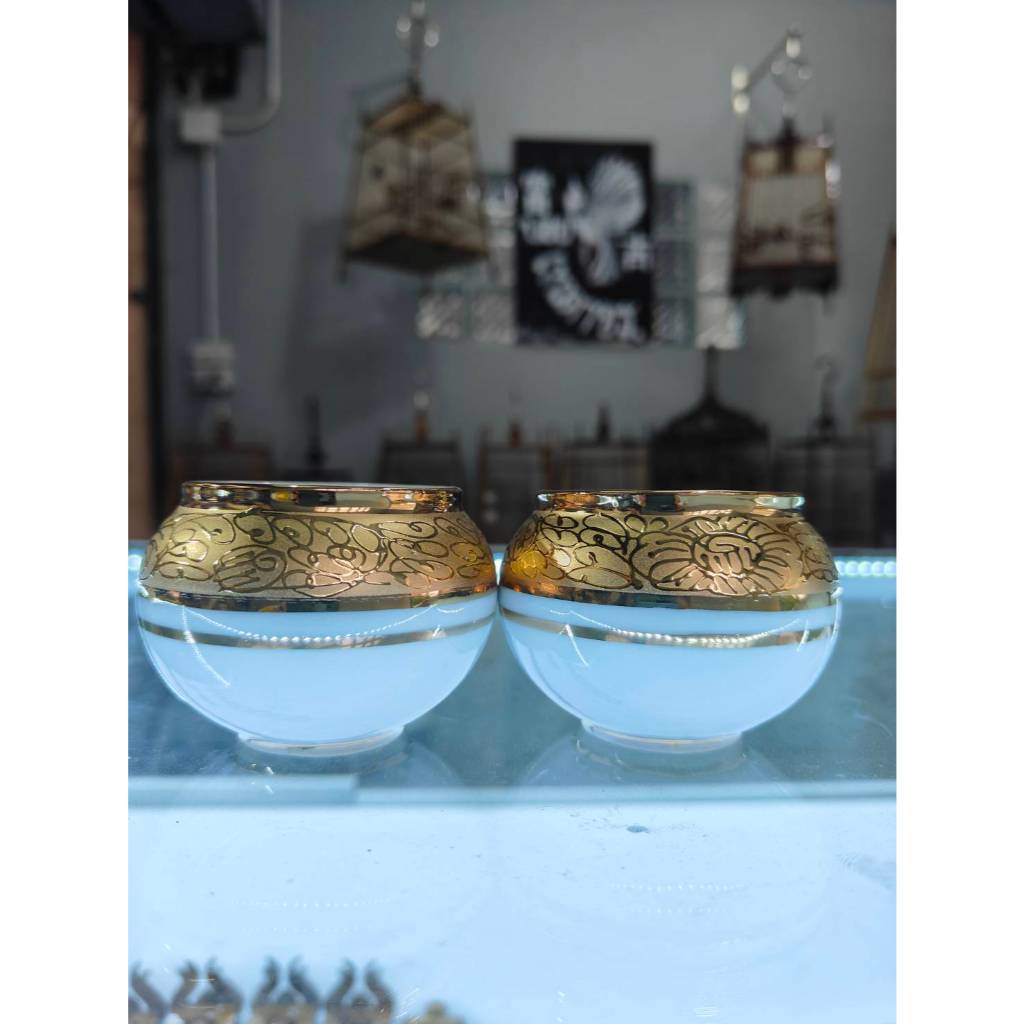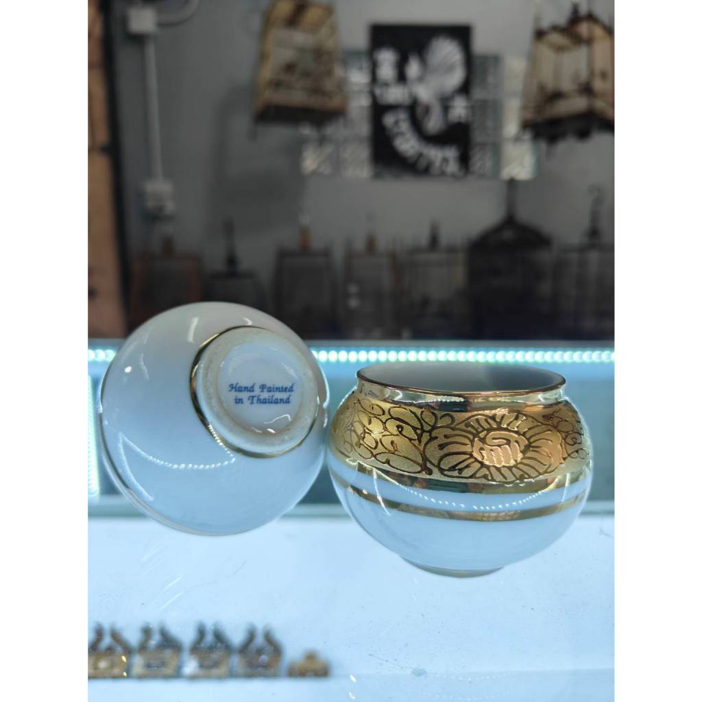 Hand Painted in Thailand แก้วน้ำนก แก้วใส่น้ำ-ใส่อาหารนกกรงหัวจุก แก้วทองครึ่งใบ