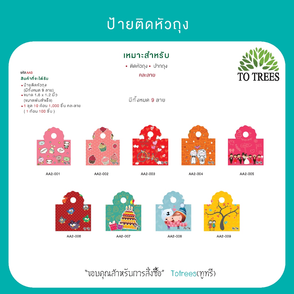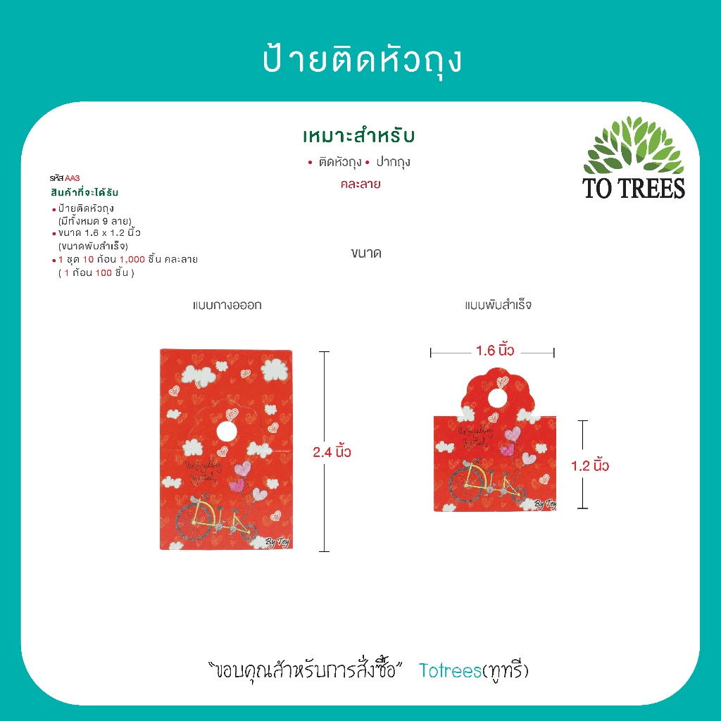 Totrees ป้ายติดหัวถุงหัวกระดาษ กระดาษติดหัวถุง ขนาดพับสำเร็จ 1.6x1.2 นิ้ว 1,000 ชิ้น คละลาย รหัส AA3