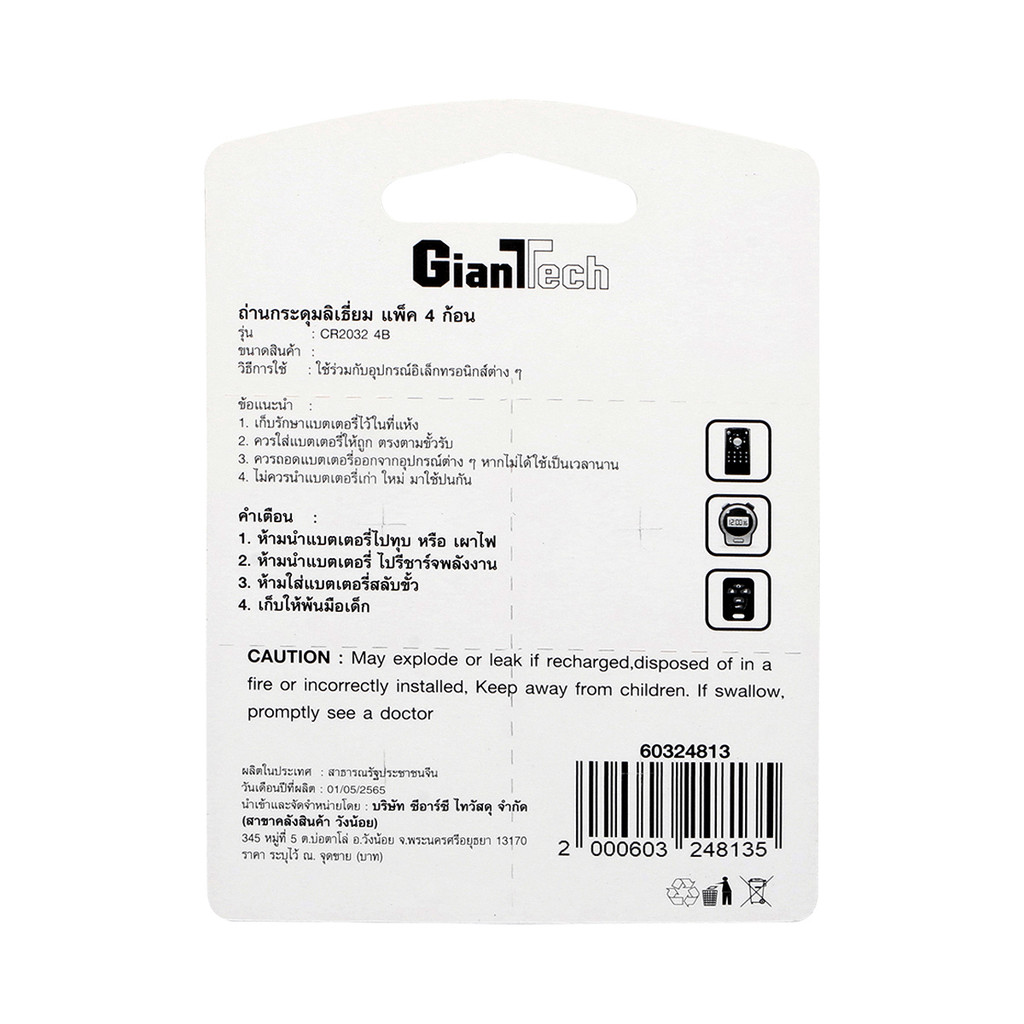 GIANTTECH ถ่านกระดุมลิเธี่ยม รุ่น CR-2032 (แพ็ค 4 ก้อน)