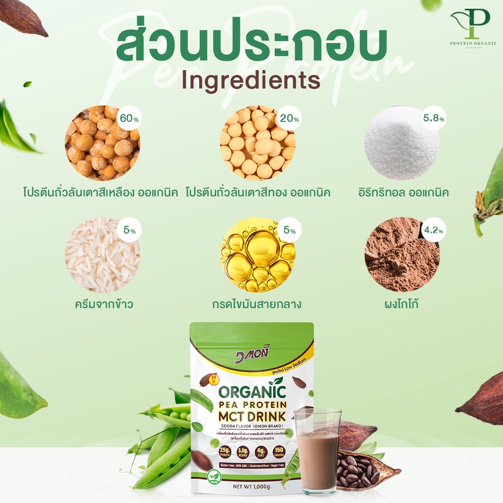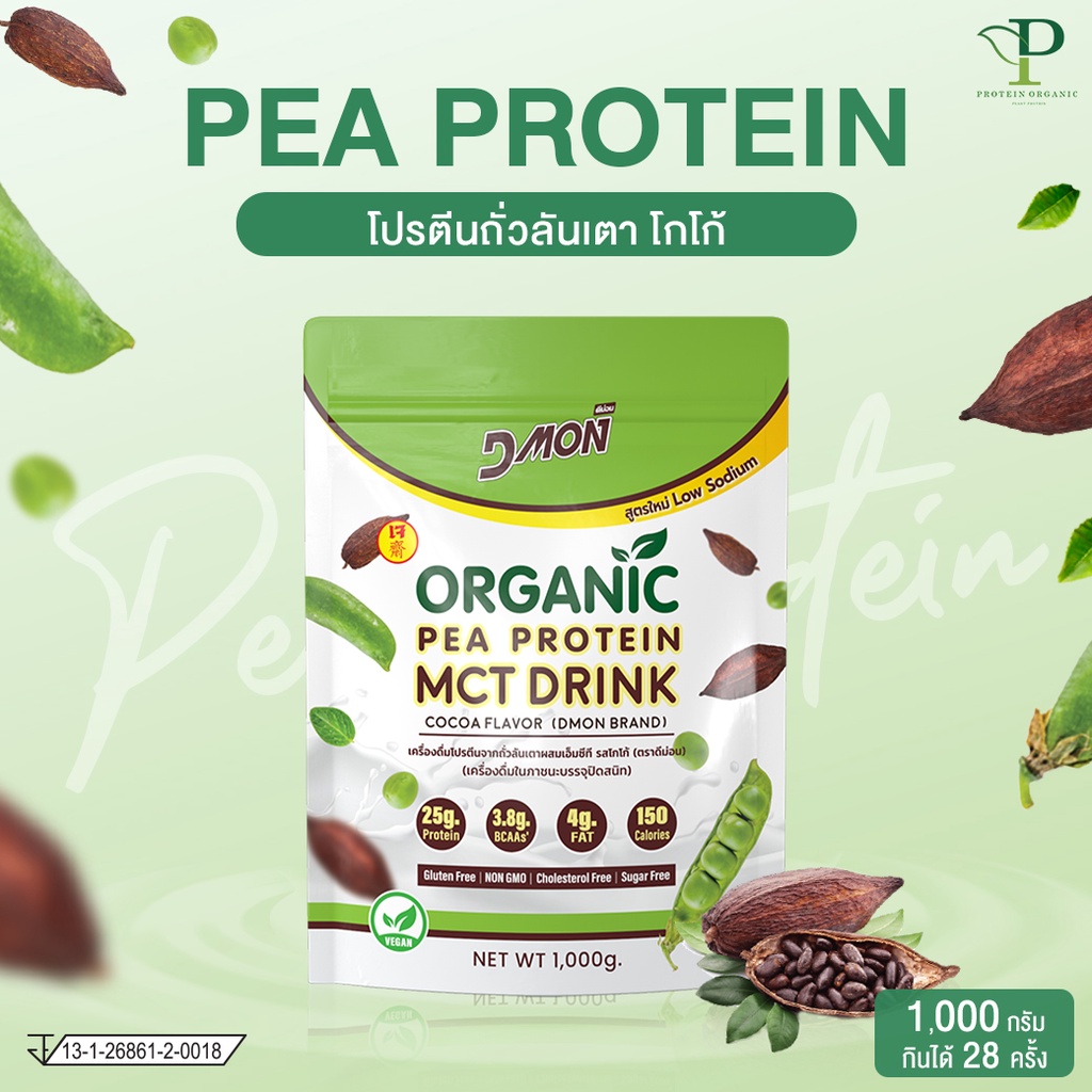 โปรตีนถั่วลันเตา ผสม MCT รสโกโก้ (สูตรเจ) | (Vegan) ขนาด 1,000 กรัม | P Protein Organic