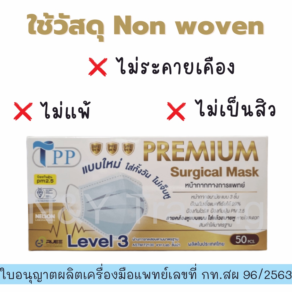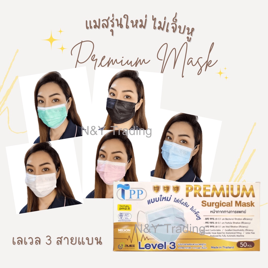 TPP Premium หน้ากากอนามัยทางการแพทย์ เลเวล 3 รุ่นใหม่ สายแบนใส่สบายไม่เจ็บหู