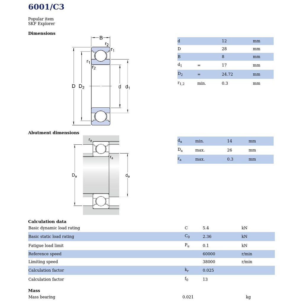 6001/C3 SKF ตลับลูกปืนเม็ดกลมล่องลึก ฝาเปิด รองรับความเร็วรอบและความร้อนสูง 6001 C3 (12mm x 28mm x 8mm)