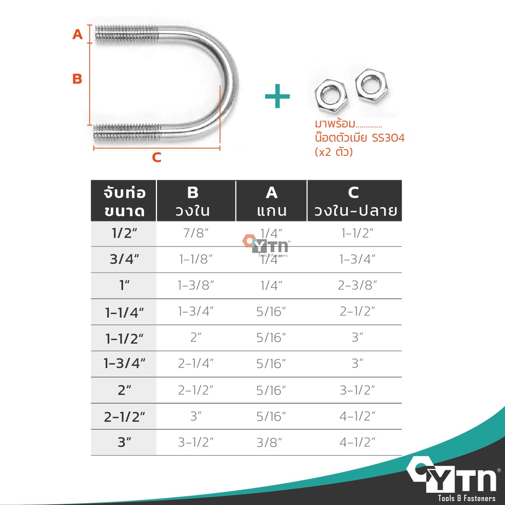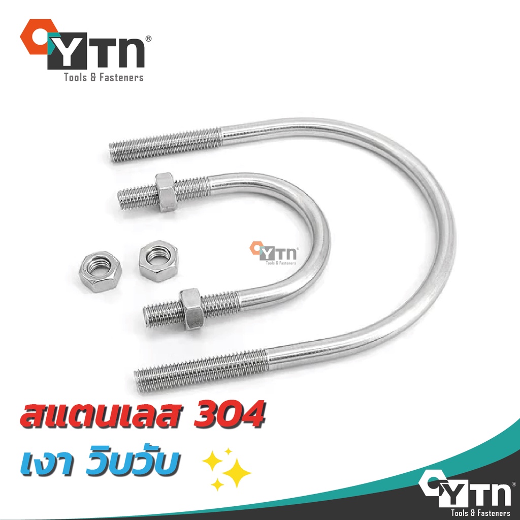 [1 ชุด] U-bolt ยูโบลท์จับท่อ สแตนเลส + 2 หัวน็อต | จับท่อขนาด 1/2" - 3"