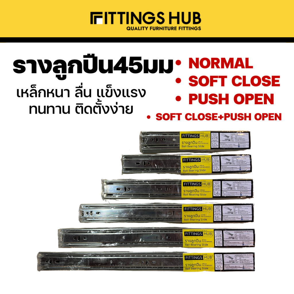 [ลัง 10 / 15 ชุด] รางลิ้นชักลูกปืน 45มม ธรรมดา/Soft close/Push open/Soft close+Push open พร้อมสกรู แข็งแรง ทนทาน Fitting