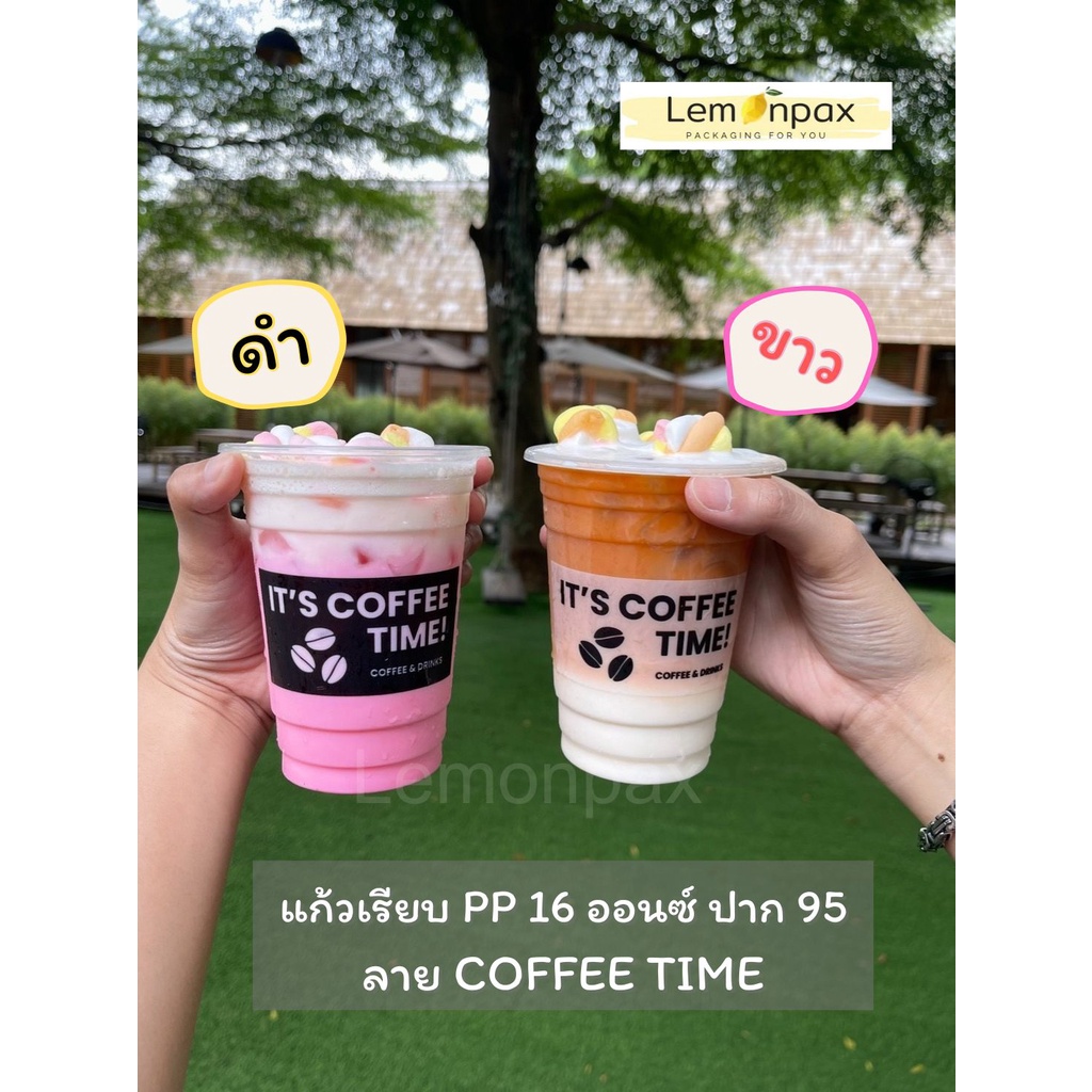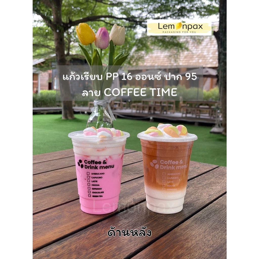 แก้วเรียบ PP 16ออนซ์ และ 22ออนซ์ ปาก95 แก้วพลาสติก พิมพ์ลาย แก้วลาย Coffee time บรรจุ 50 ชิ้น/แพ็ค