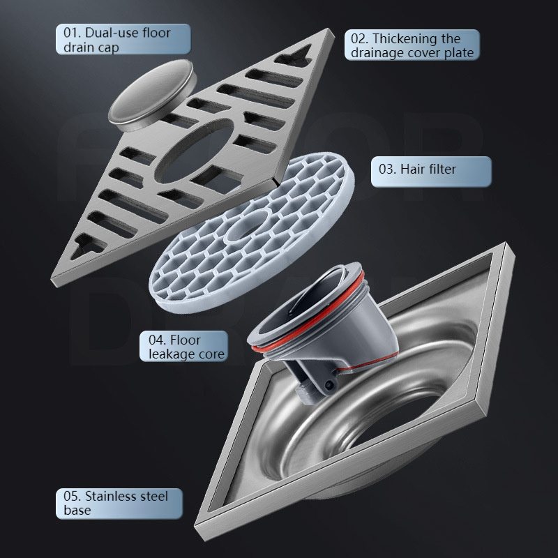 ท ่ อระบายน ้ ําพื ้ นสแตนเลสสีเทา Xinkunlong 304 พร ้ อมกลิ ่ นและป ้ องกันแมลง