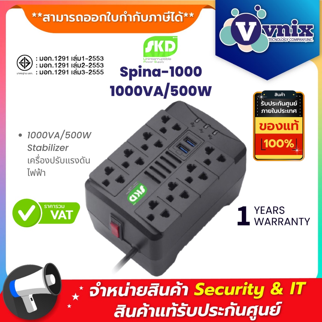 SKD Stabilizer Spina-1000 1000VA/500W AUTOMATIC VOLTAGE REGULATOR เครื่องปรับแรงดันไฟฟ้า ประกัน 1 ปี By Vnix Group