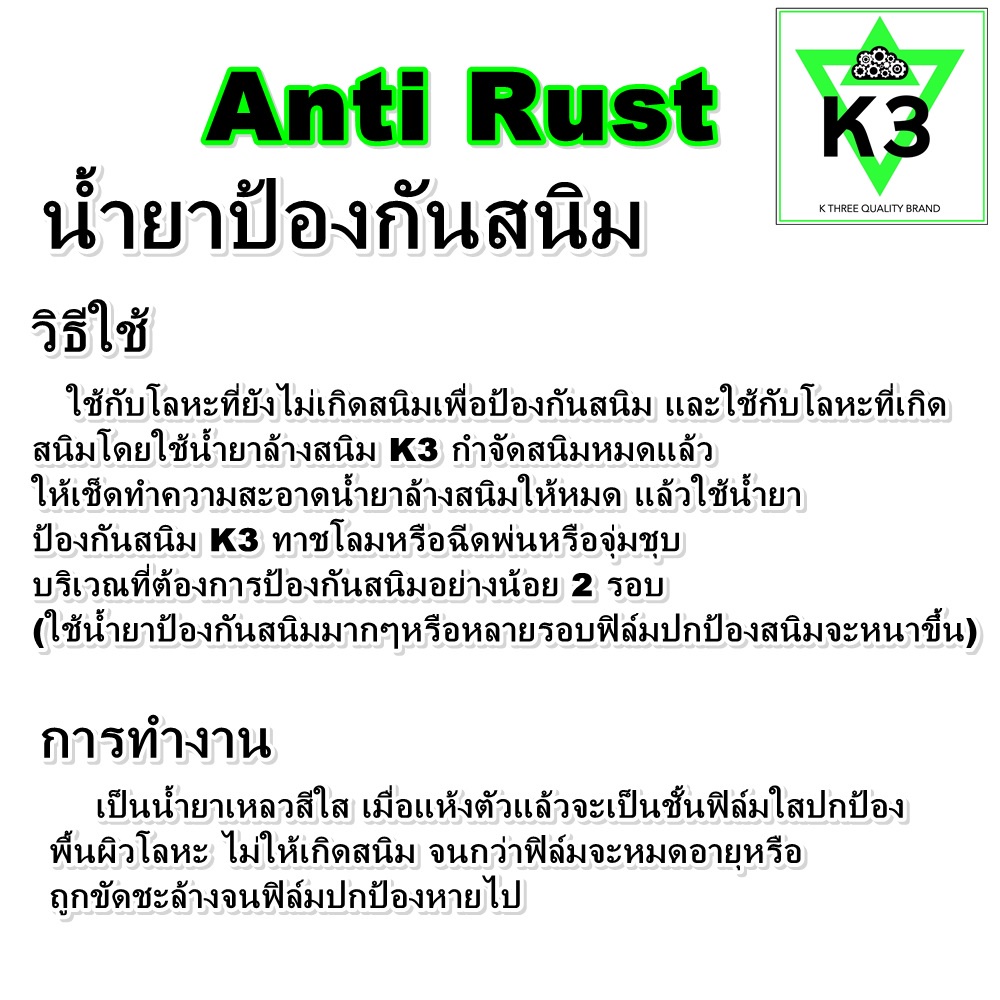 น้ำยาป้องกันสนิม เค3 Anti Rust K3 ใช้งานง่าย สะดวก ทาชโชม ใช้ฉีดพ่น หรือ จุ่มชุบ (ขนาด 100 ml, 30 ml.)