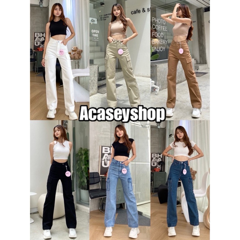 Acasey กางเกงยีนส์ผู้หญิง ขายาว กระบอก ดีเทลกระเป๋าข้าง รุ่น คาร์โก้ Chu5kg