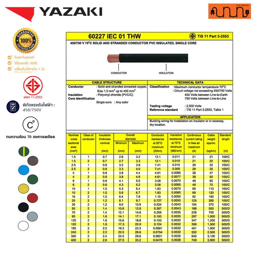 (แบ่งตัด 10 เมตร)สายไฟTHW ยี่ห้อ Yazaki 1x1.5 /1x2.5 /1x4 /1x6 sq.mm ทองแดง 60227 IEC 01 (YK)