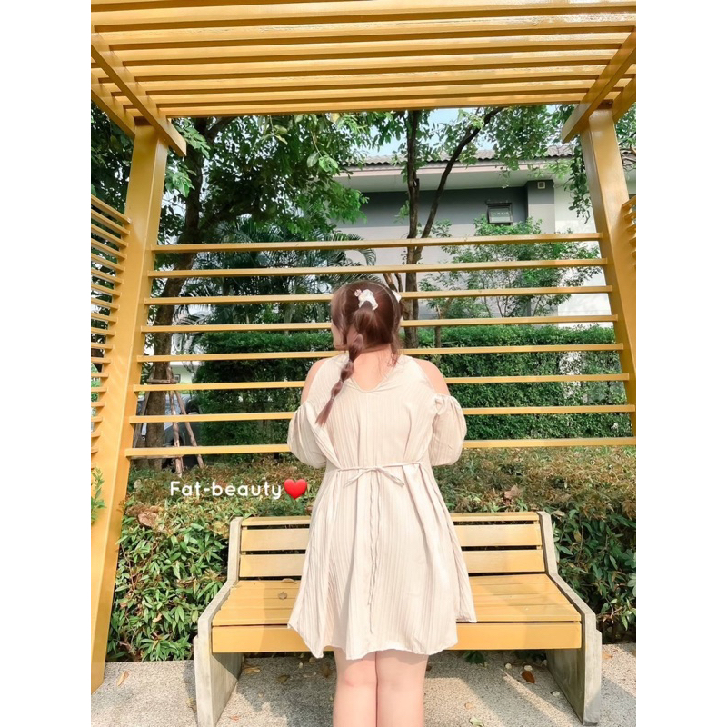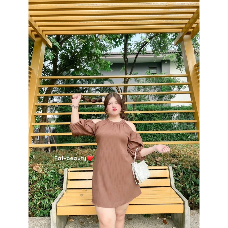 FB🌷เดรสคอกลมเว้าไหล่ดึงยางไหล่เบาๆ แขนยาวจั้มแขน ไซส์ใหญ่ plussize