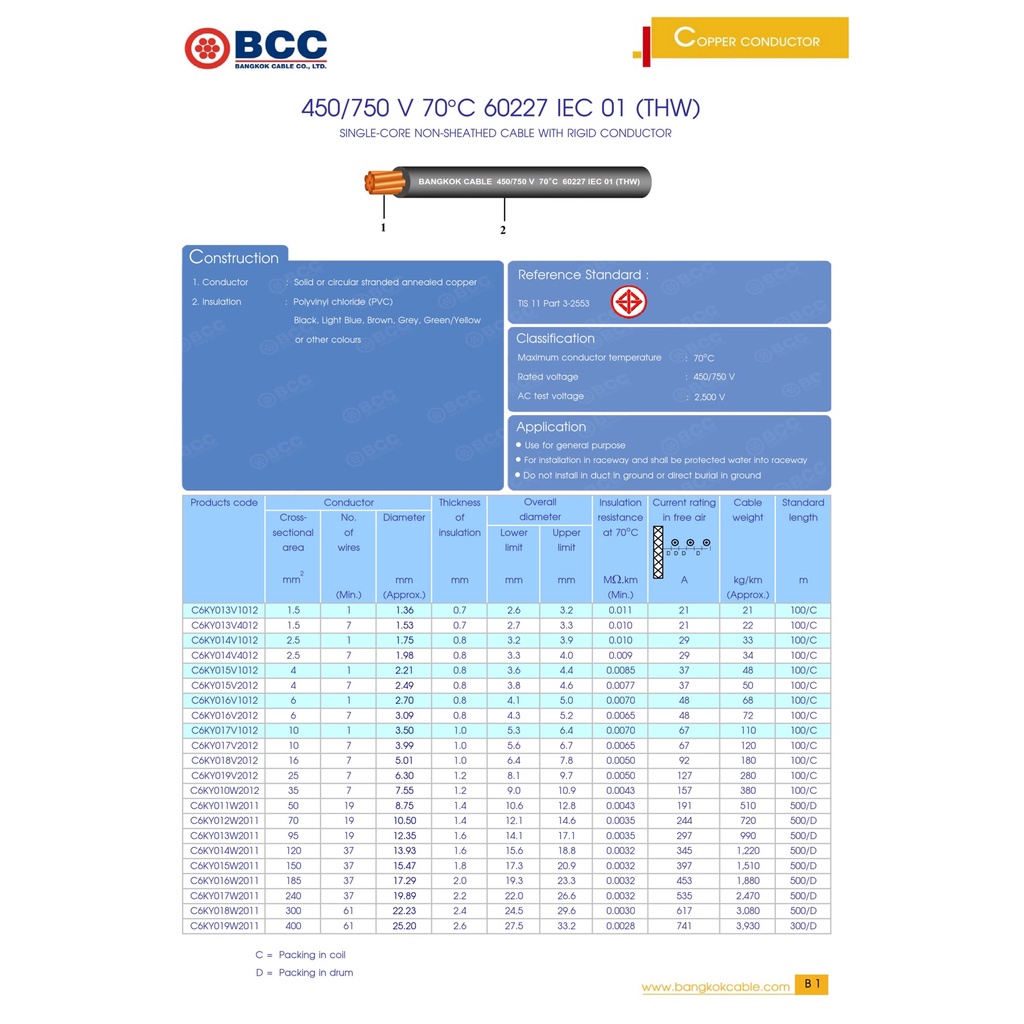 BCC สายไฟ THW 16 sq.mm. (ราคา 5, 10, 15 เมตร) มี 3 สี IEC01 450/750V สายทองแดง สายไฟฟ้า บางกอกเคเบิ้ล กราวด์ THW16