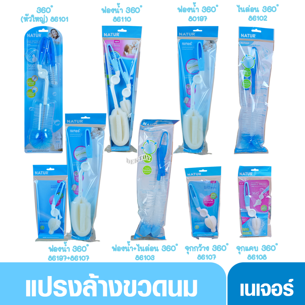 Natur เนเจอร์ แปรงล้างขวดนมและจุกนม แบบฟองน้ำ และแบบไนล่อน ด้ามหมุน360องศา