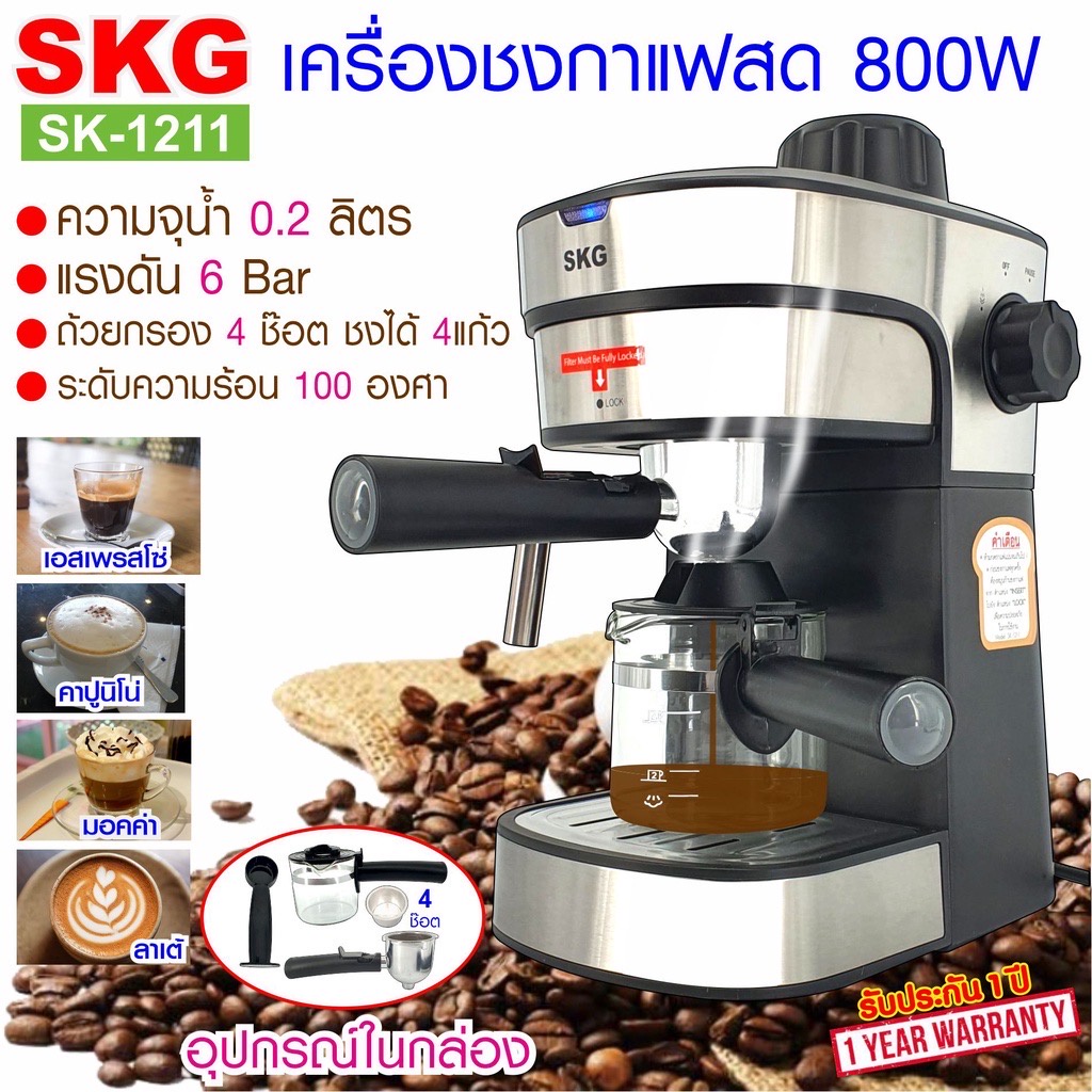 SKG เครื่องชงกาแฟสด 800W 0.2ลิตร ถ้วยกรอกจุ 4ช๊อต รุ่น SK-1211 สีเงิน [ฟรีเครื่องบดเมล็ดกาแฟ]