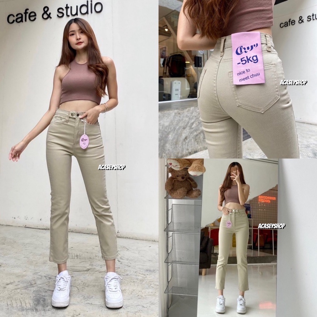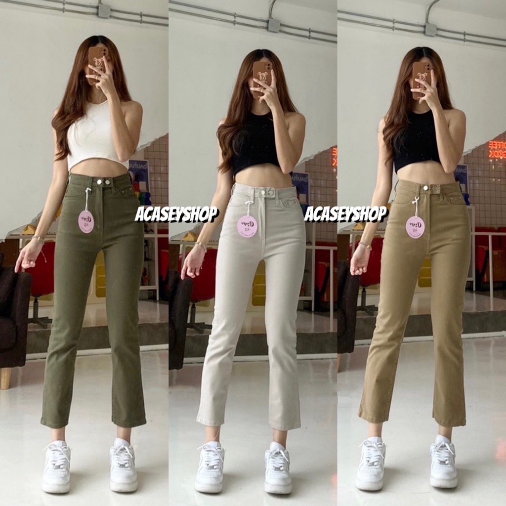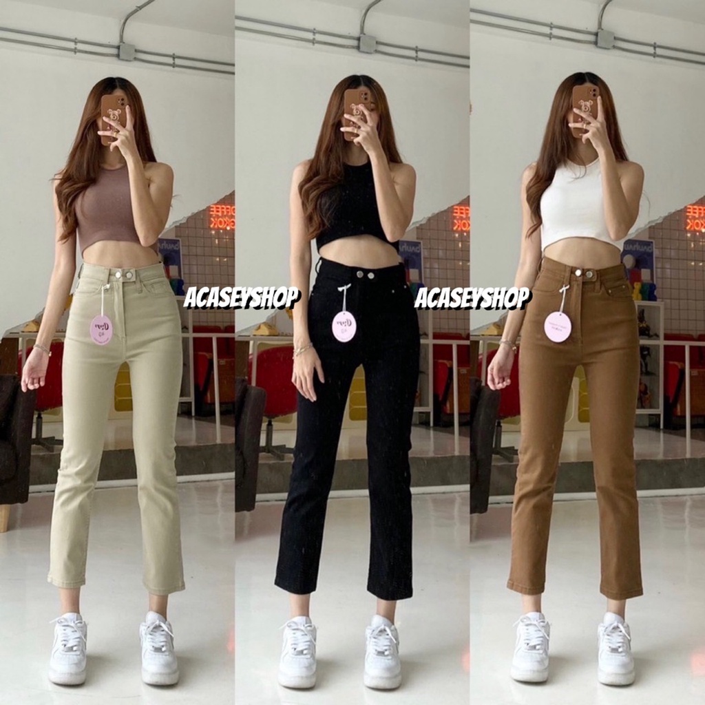 Acasey กางเกงยีนส์ผู้หญิง ขายาว ทรงบอยสลิม สีผ้านอกนำเข้าผ้ายืด รุ่น Boy ดีเทล2กระดุม Gm