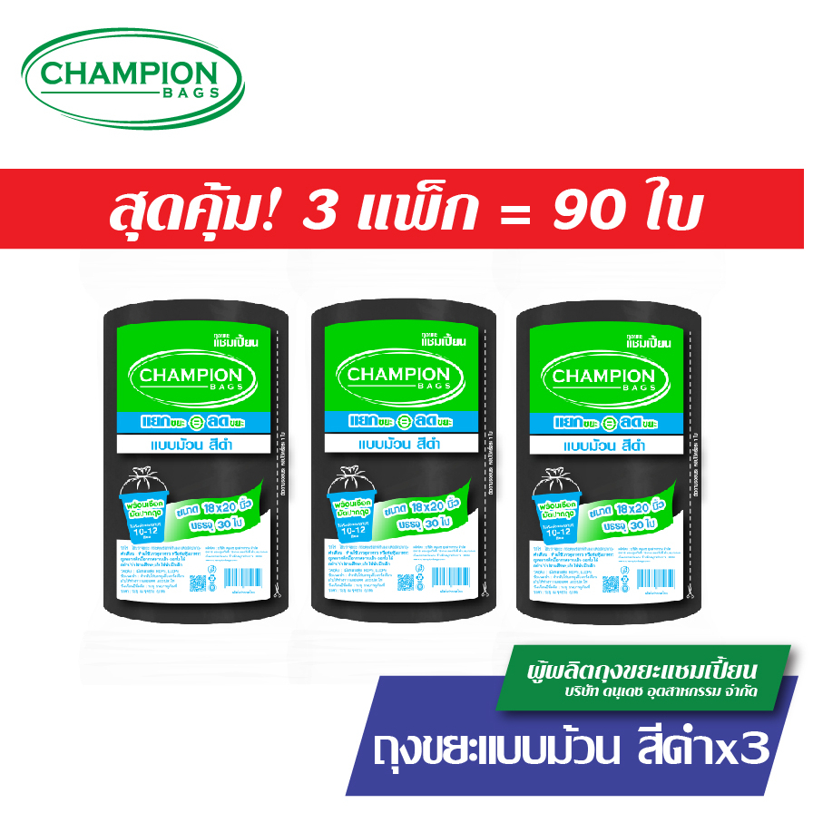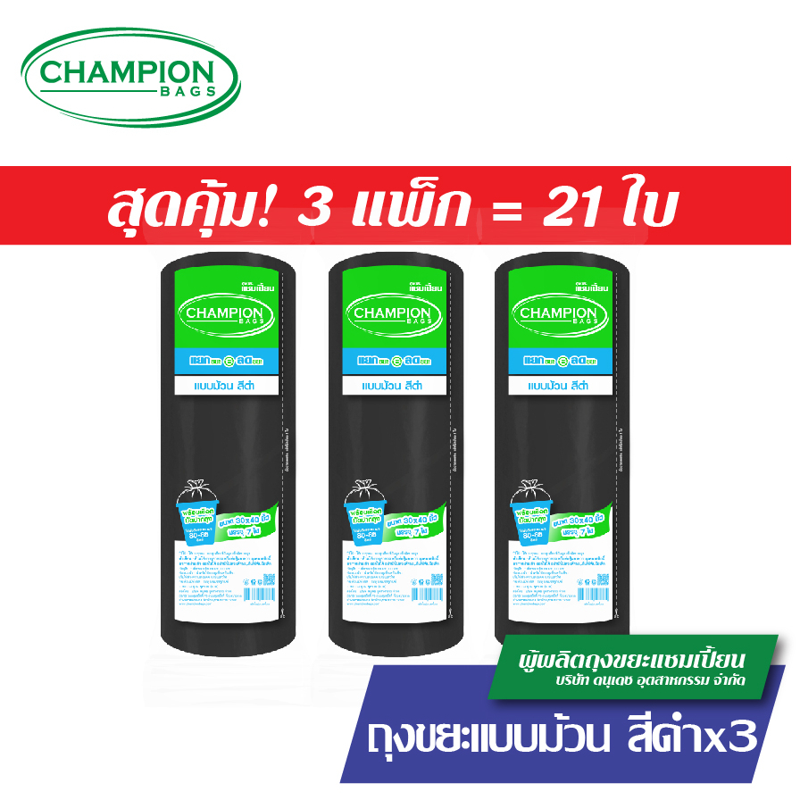 แพ็ค 3-ม้วนดำ(ดึงได้ทีละใบ-รุ่นประหยัด)Champion Bags ถุงขยะแชมเปี้ยน
