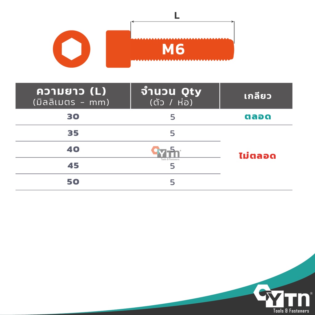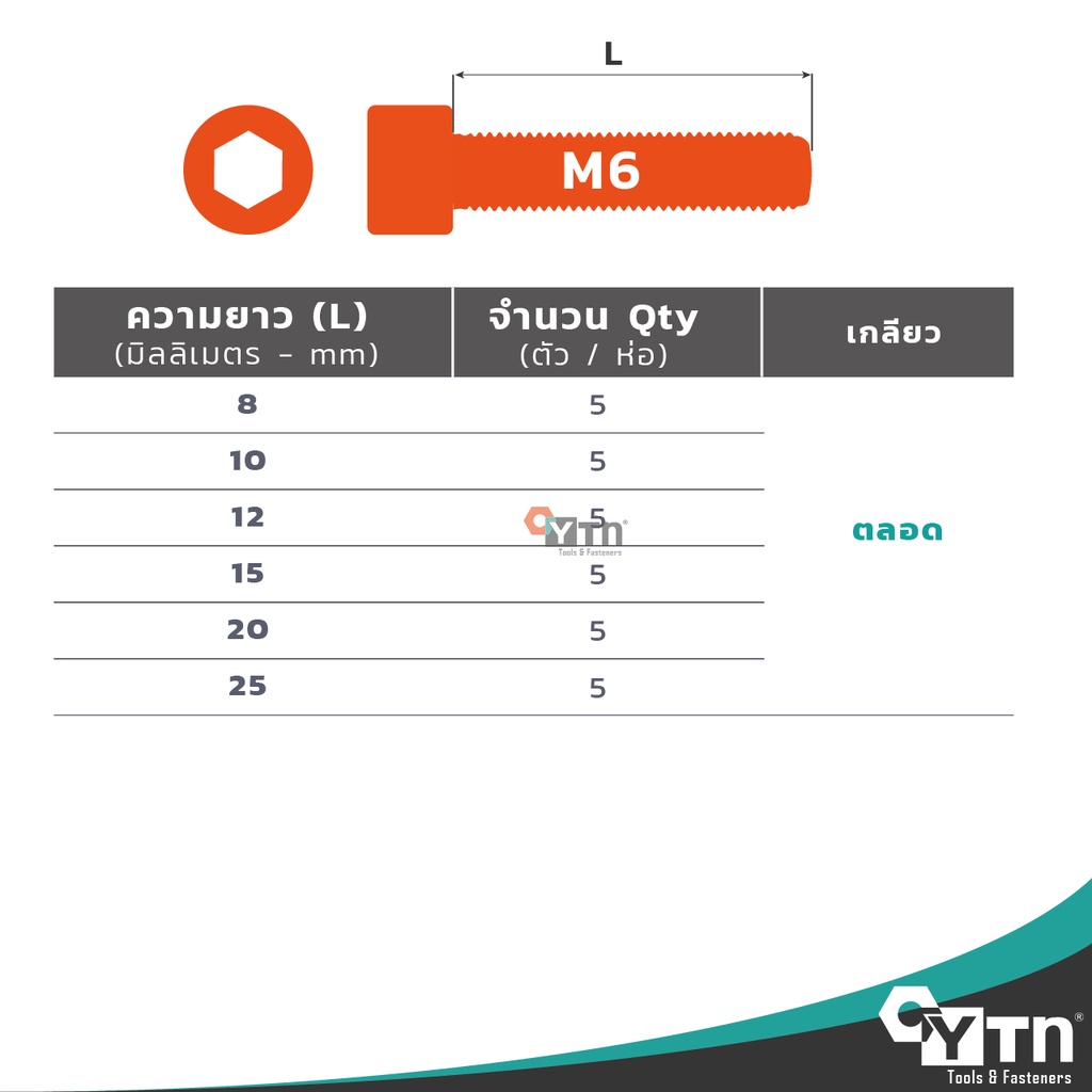 [5ตัว] น็อต สกรูหัวจมหกเหลี่ยม สแตนเลส | ขนาด M6