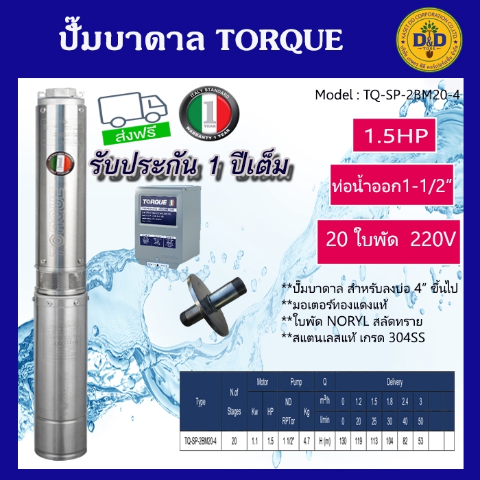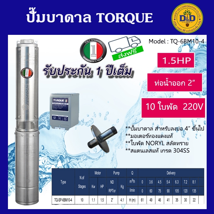 TORQUE 🇹🇭 ปั๊มบาดาล 1.5HP 220V ดูดน้ำลึก submersible ปั๊มน้ำอิตาลี ทอร์ค(แถม กล่องสตาร์ทและฝาบ่อ)