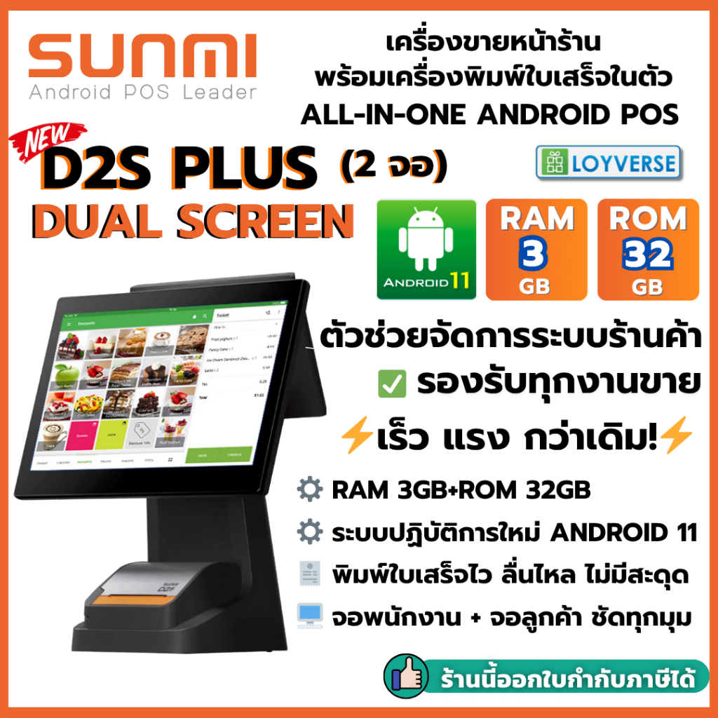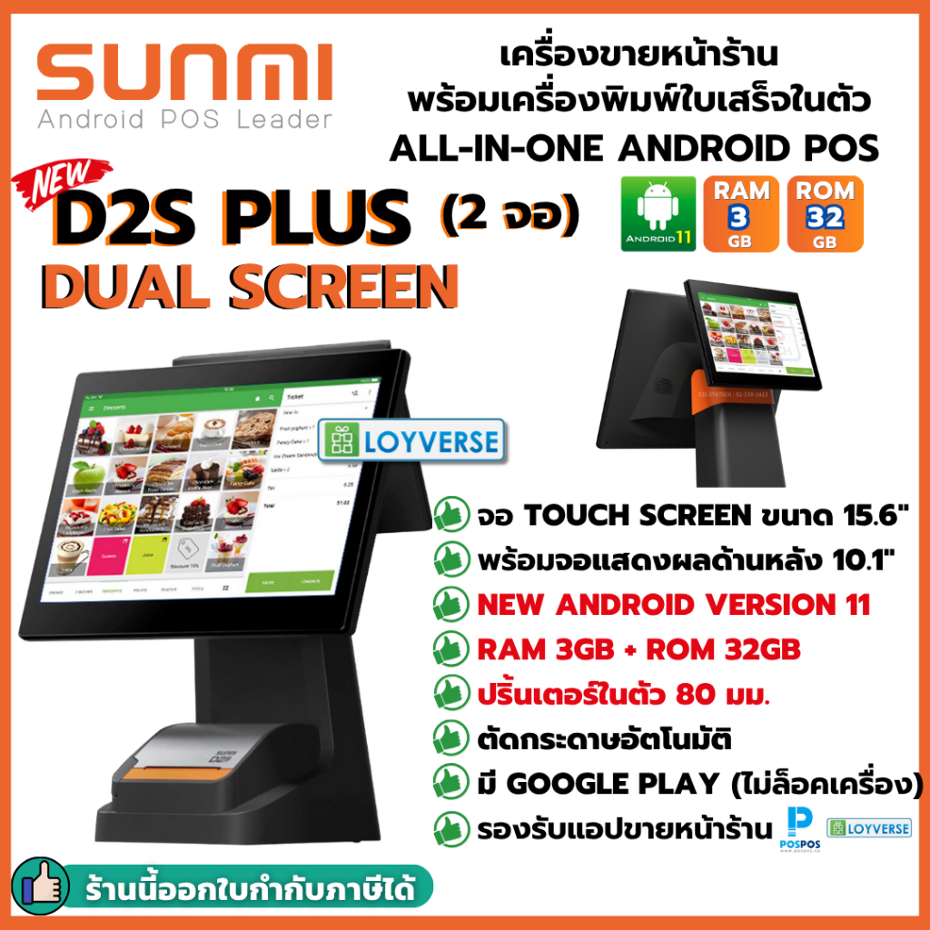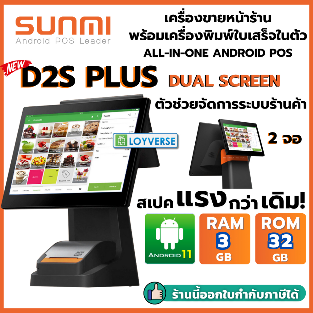 SUNMI D2s PLUS Dual 15.6"+10.1" เครื่อง Android POS แบบ All in one ปริ้นใบเสร็จในตัว Android 11