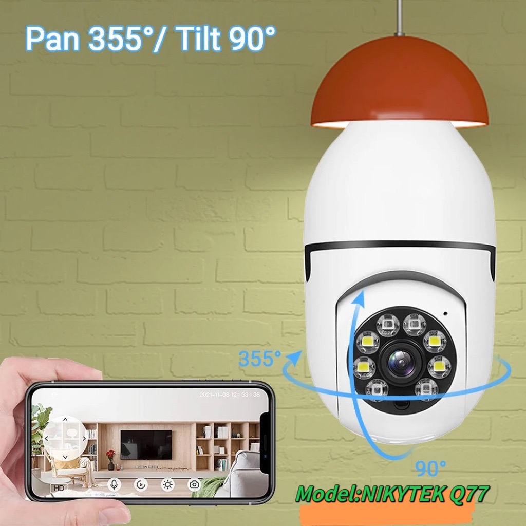 ICsee 3MP (NIKYTEK Q77 )หลอดไฟ Wifi PTZ กล้อง360หมุนสีสัน Nightvision กล้อง PTZ IP ไร้สาย ICsee HD 2K วิดีโอในร่ม secur