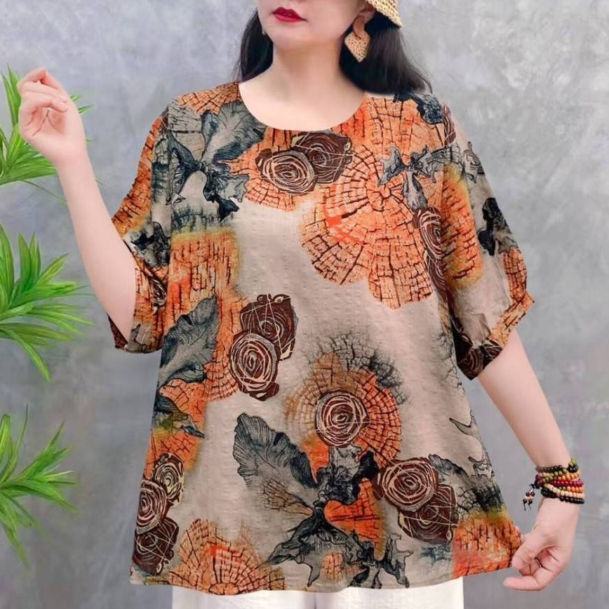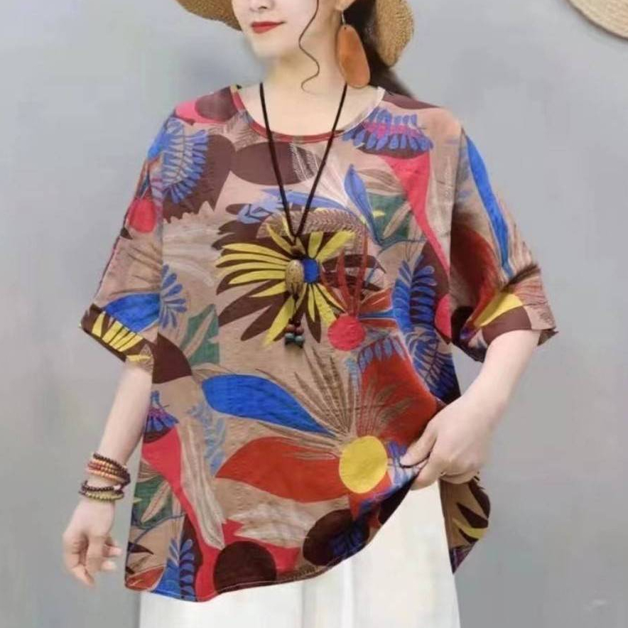 เสื้อผู้หญิงแขนสั้นคอกลม พิมลายดอก ผ้าฝ้ายไม่ยืด (อก 50 นิ้ว) ผ้าบางเบาใส่สบาย เหมาะกับอากาศร้อน C1