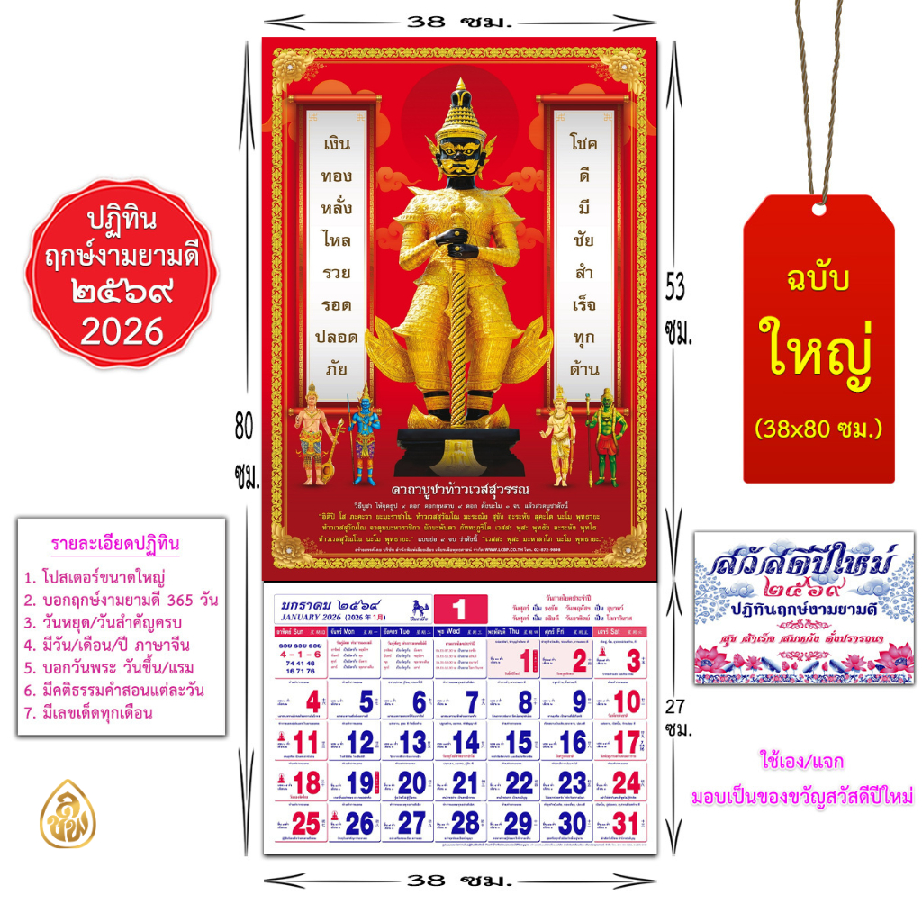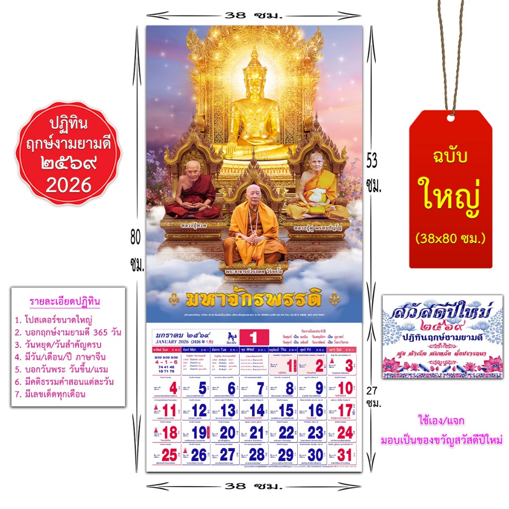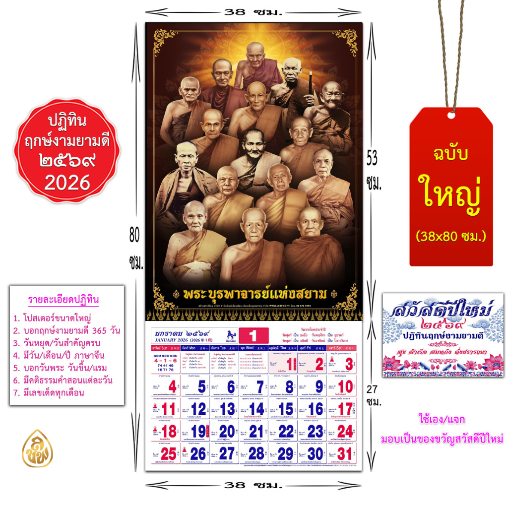 ปฏิทินปีใหม่ 2569 (ใหญ่ T4 38* 80 cm.) ปี2026 ปีมะเมีย มีให้เลือก 6ภาพฤกษ์งามยามดีครบ 365 วันพระขึ้น/แรม #เลี่ยงเชียง