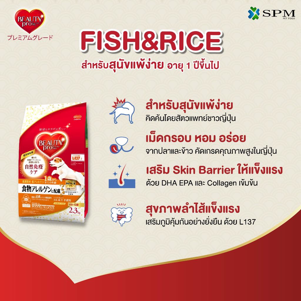 BeautyPro อาหารเม็ดสุนัขพรีเมียม สูตร Fish&Rice ปลาและข้าว สำหรับสุนัขแพ้ง่ายอายุ 1 ปี+ ขนาด 4.7 Kg.