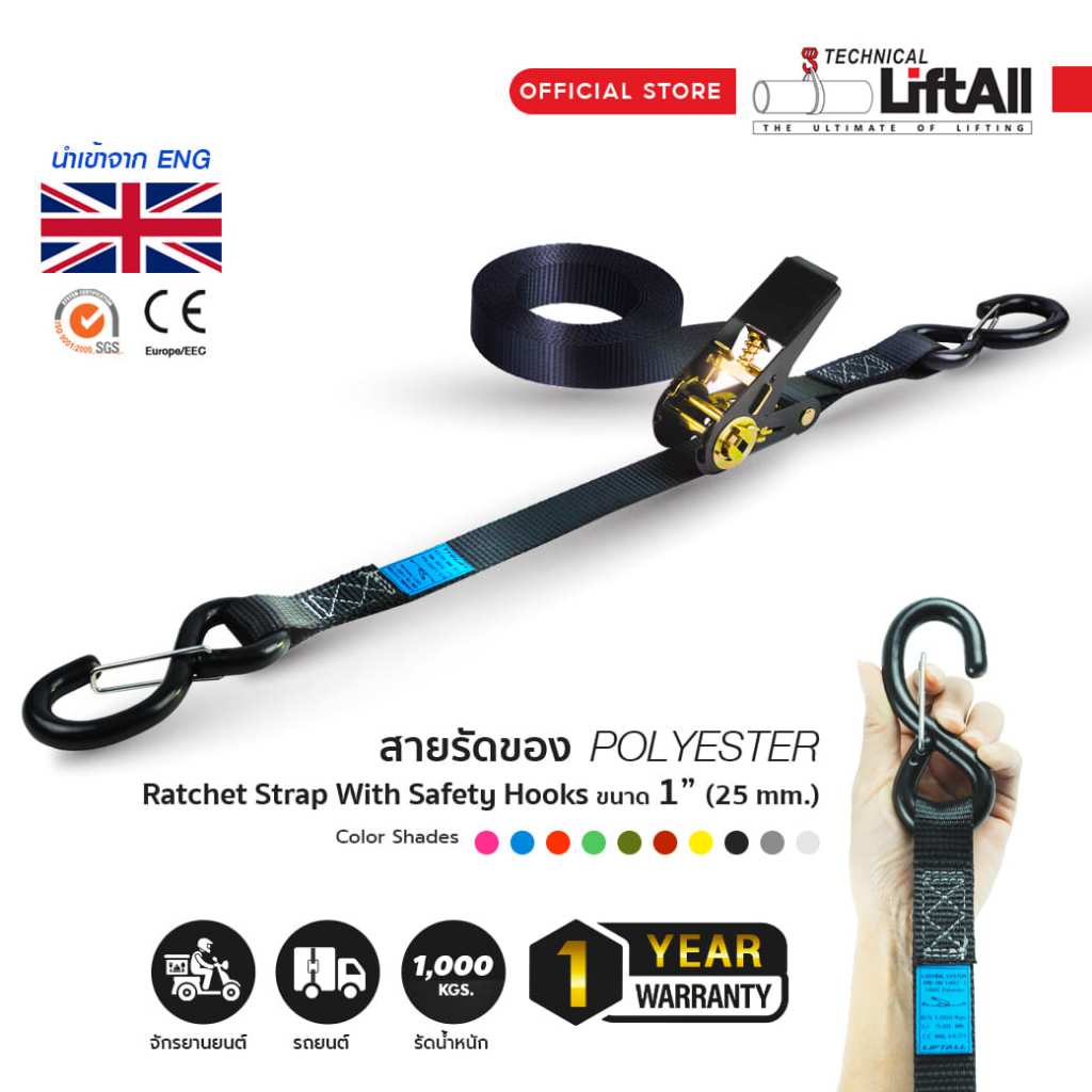 LIFTALL สายรัดของ ขนาด 1 นิ้ว รับ นน. 1 ตัน ชนิดมีตะขอล็อค LSN2510B สายรัดก๊อกแก๊ก เบลท์รัดของ เชือกรัดของ สายรัดไรเดอร์