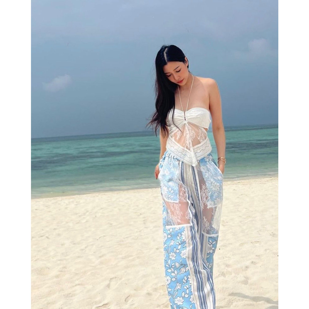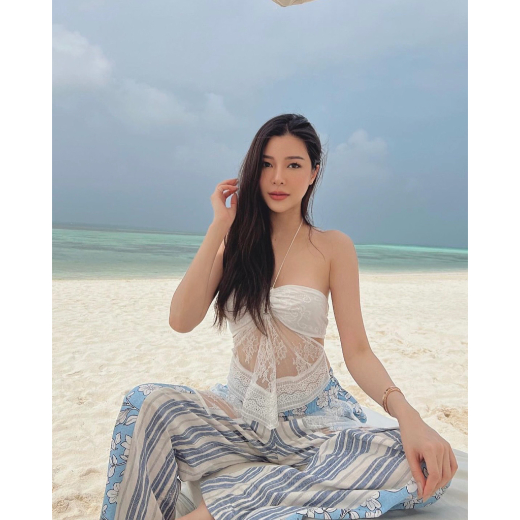 ❣️พร้อมส่ง ฟ้า ชมพู ดำ 📌 Queen Set ชุดไปทะเล ผ้าลูกไม้ผูกคอ กางเกงเอวยางยืดแต่งลูกไม้ PS.CLOSET