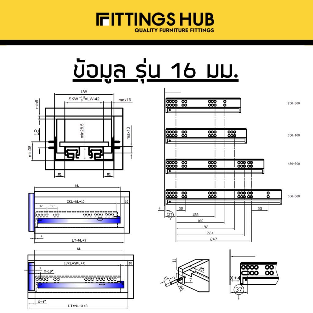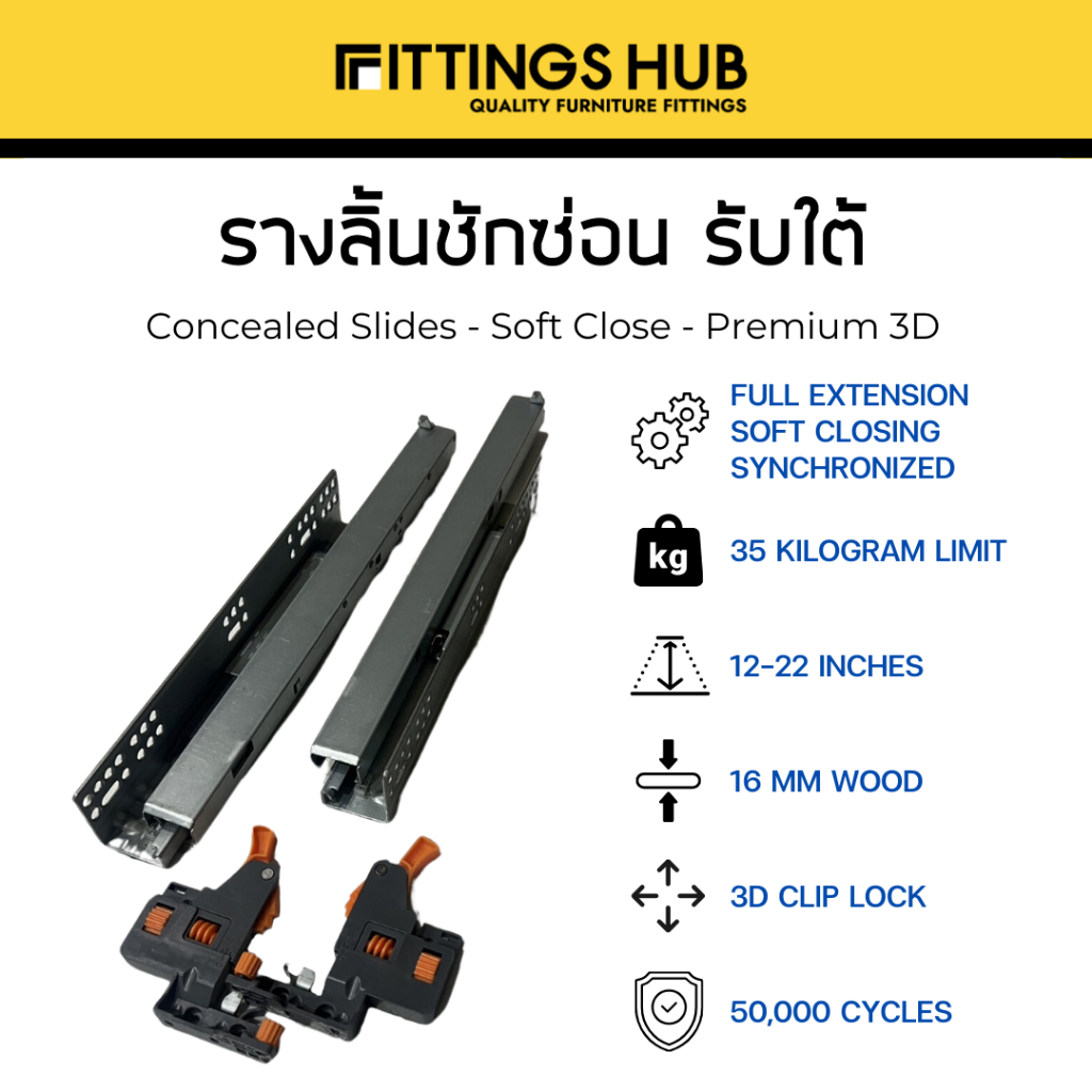 รางลิ้นชักซ่อน SOFT CLOSE / กดกระเด้ง Push open Under Mount พร้อมสกรู แข็งแรง ทนทาน FittingsHub