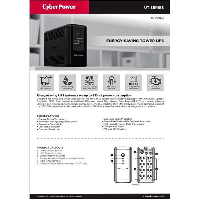 เครื่องสำรองไฟ Cyberpower UPS รุ่น UT800EG UPS800VA/480W รับประกัน Onsite 2 ปี