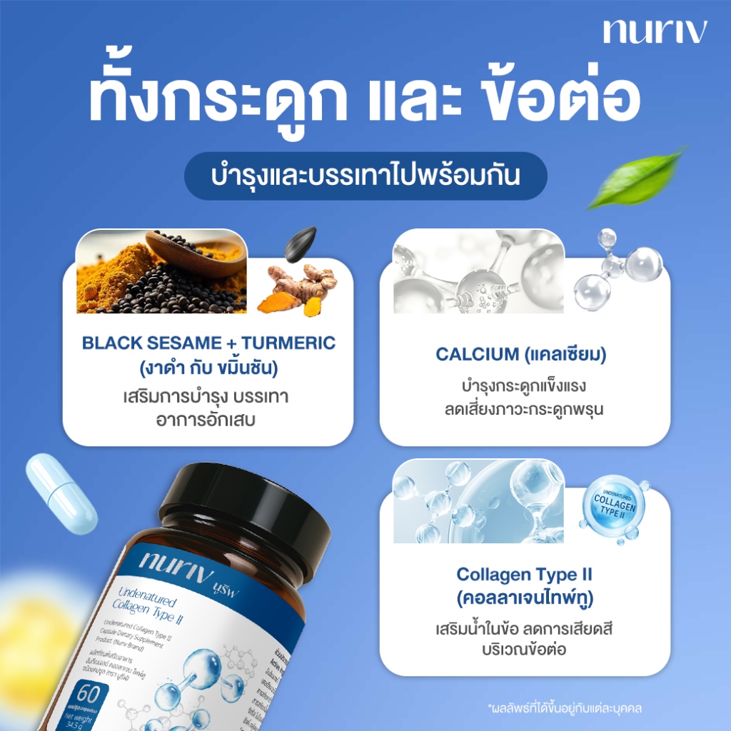 คอลลาเจนไทพ์ทูจาก Nuriv ที่ตอบโจทย์คนที่มีปัญหาเรื่องข้อต่อและกระดูกมากครับ มีส่วนผสมของงาดำและขมิ้นชันที่ช่วยลดการอักเสบได้ดีเยี่ยม แคปซูลทานง่ายดูดซึมเร็ว ช่วยให้การเคลื่อนไหวคล่องตัวขึ้นอย่างเห็นผลพรีเมียมจริงๆ ครับ