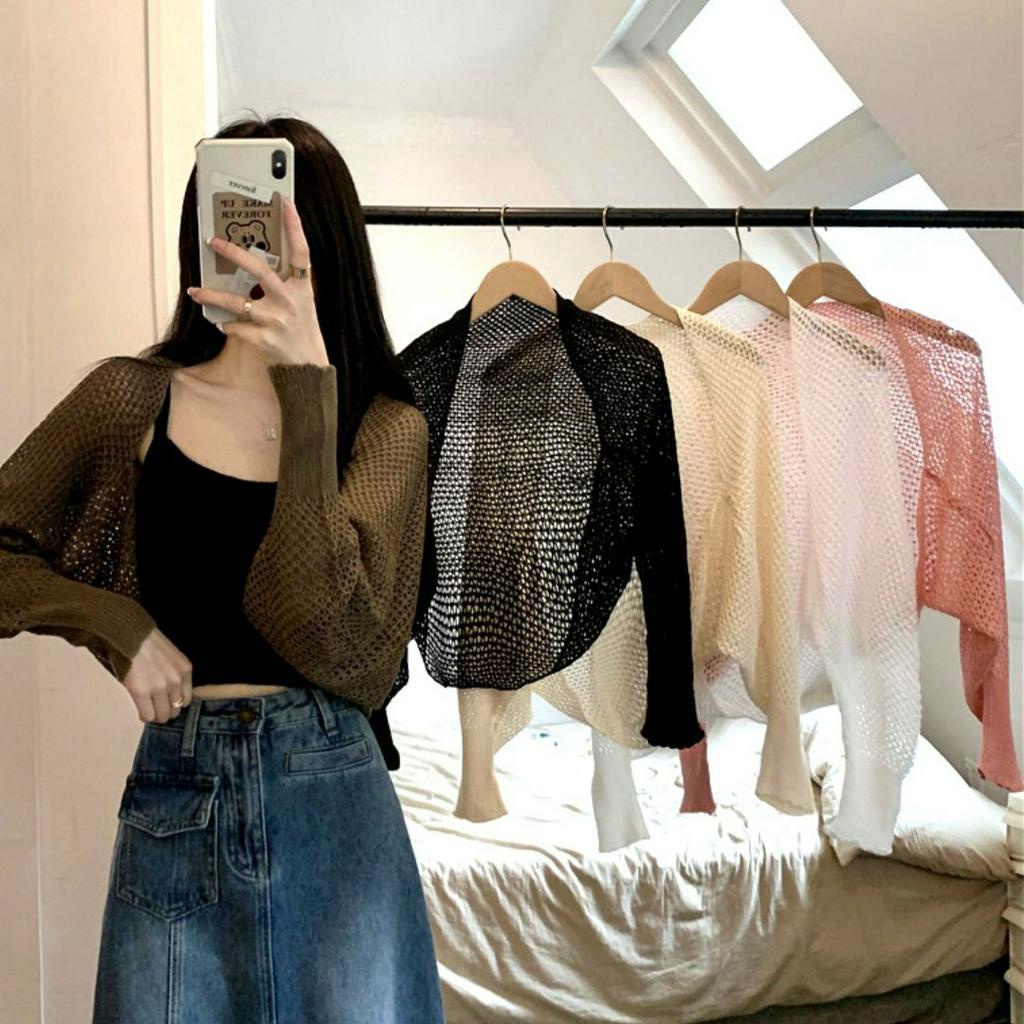 [W0026] เสื้อคลุม แขนยาว ผ้าไหมพรม ถักตาข่าย แบบบาง สไตล์เกาหลี เสื้อแฟชั่นผู้หญิง คาร์แกนแขนยาว