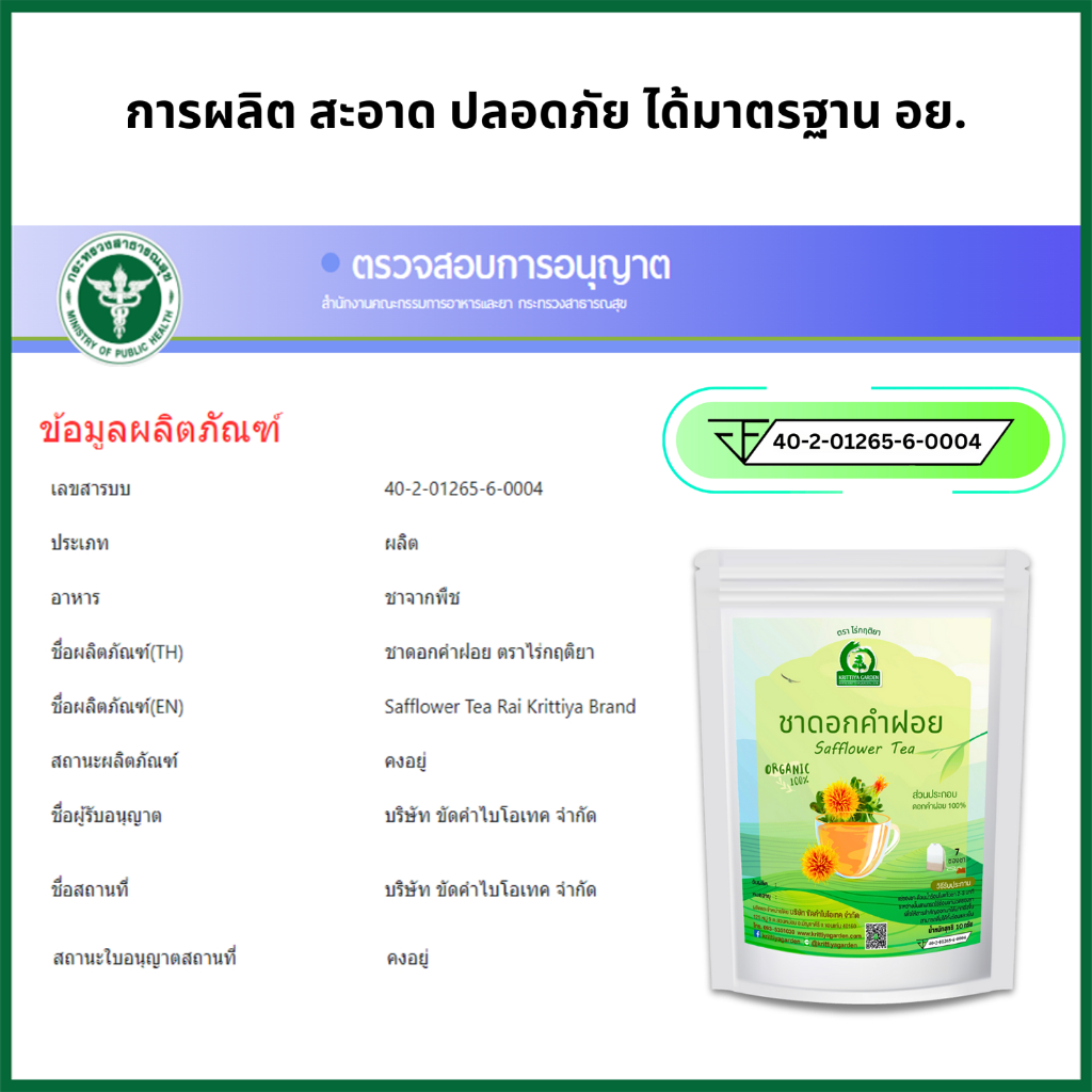 ชาดอกคำฝอย ตราไร่กฤติยา (Safflower Tea) มี อย. สะอาด ปลอดภัย ได้มาตรฐาน