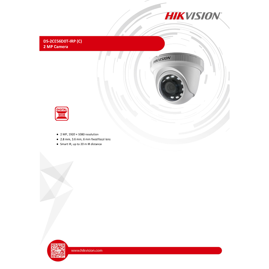 HIKVISION DS-2CE56D0T-IRP (C) (2.8 mm.) กล้องวงจรปิดระบบ HDTVI 2 MP ปรับระบบไม่ได้ ต้องใช้งานร่วมกับเครื่องบันทึก